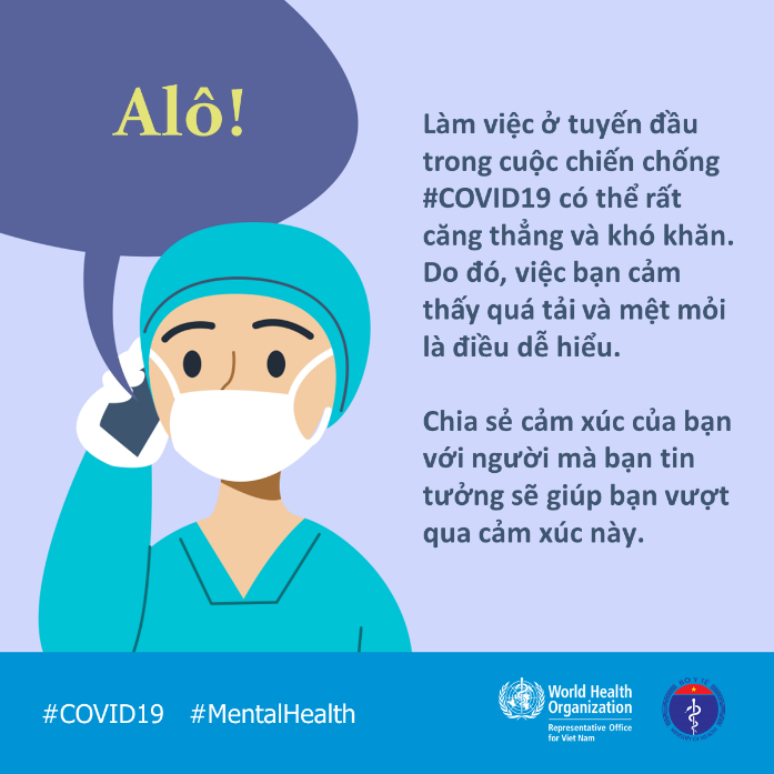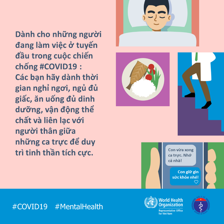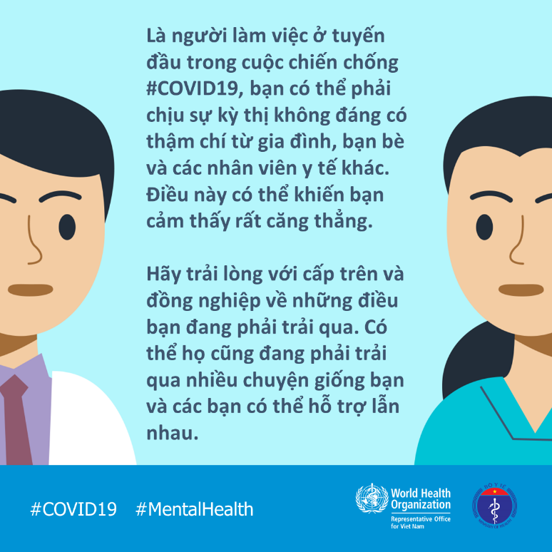 Trong đại dịch, nhân viên y tế nhất là ở tuyến đầu sẽ chịu nhiều áp lực trong cuộc chiến chống COVID19. Hãy biết rằng bạn không đơn độc. Hãy trải lòng về những cảm xúc của bạn với người mà bạn tin tưởng. Để duy trì tinh thần lạc quan, bạn cần được nghỉ ngơi, tập thể dục, ăn uống đủ chất, và duy trì kết nối với người thân giữa các ca trực.