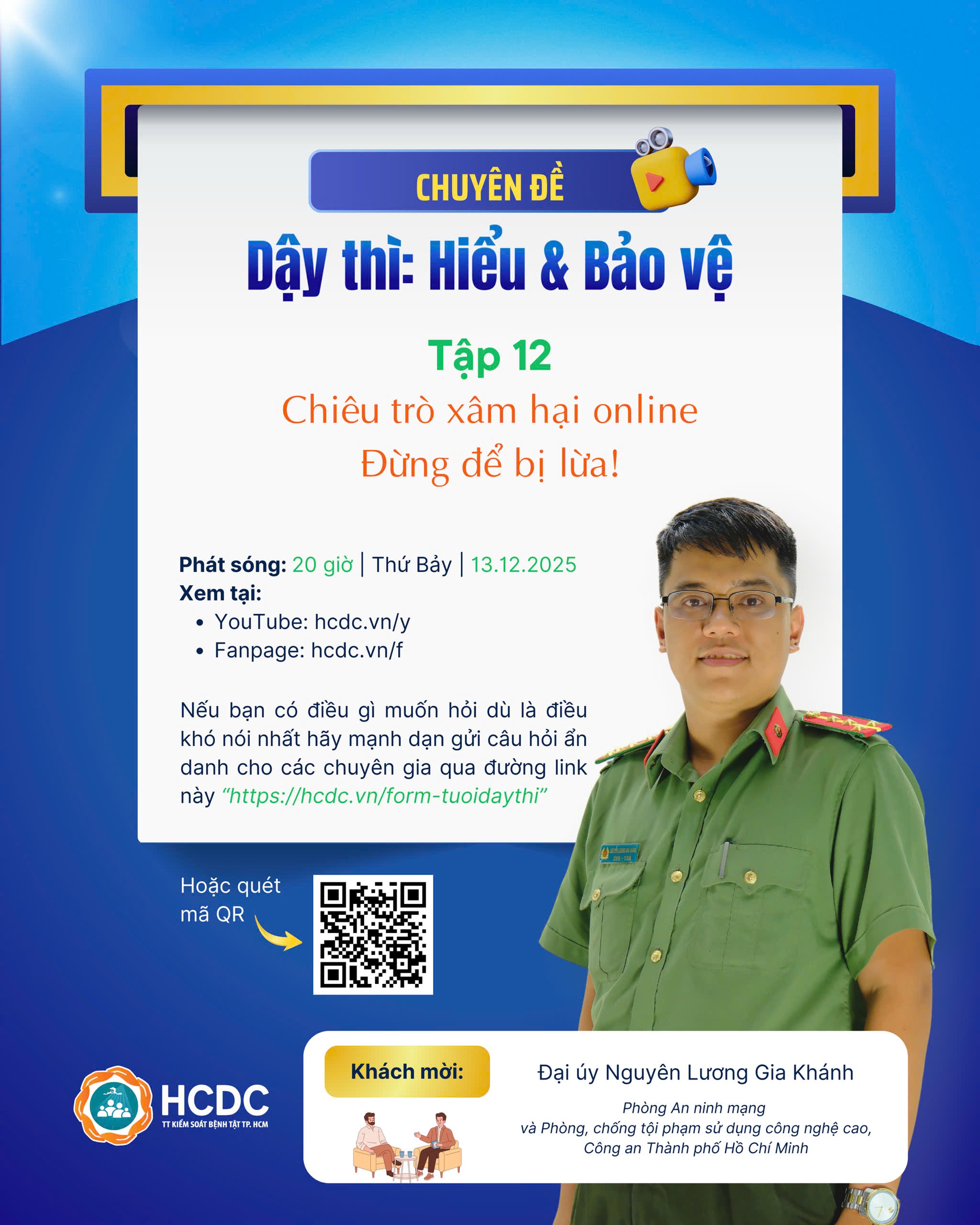“Chiêu trò xâm hại online – Đừng để bị lừa!” sẽ phát sóng lúc 20 giờ Thứ Bảy, ngày 13.12.2025 trên kênh Fanpage và Youtube của Trung tâm Kiểm soát bệnh tật Thành phố Hồ Chí Minh. Nếu có bất kỳ thắc mắc nào dù là khó nói nhất, bạn có thể gửi ẩn danh đến các chuyên gia qua đường link https://hcdc.vn/form-tuoidaythi.