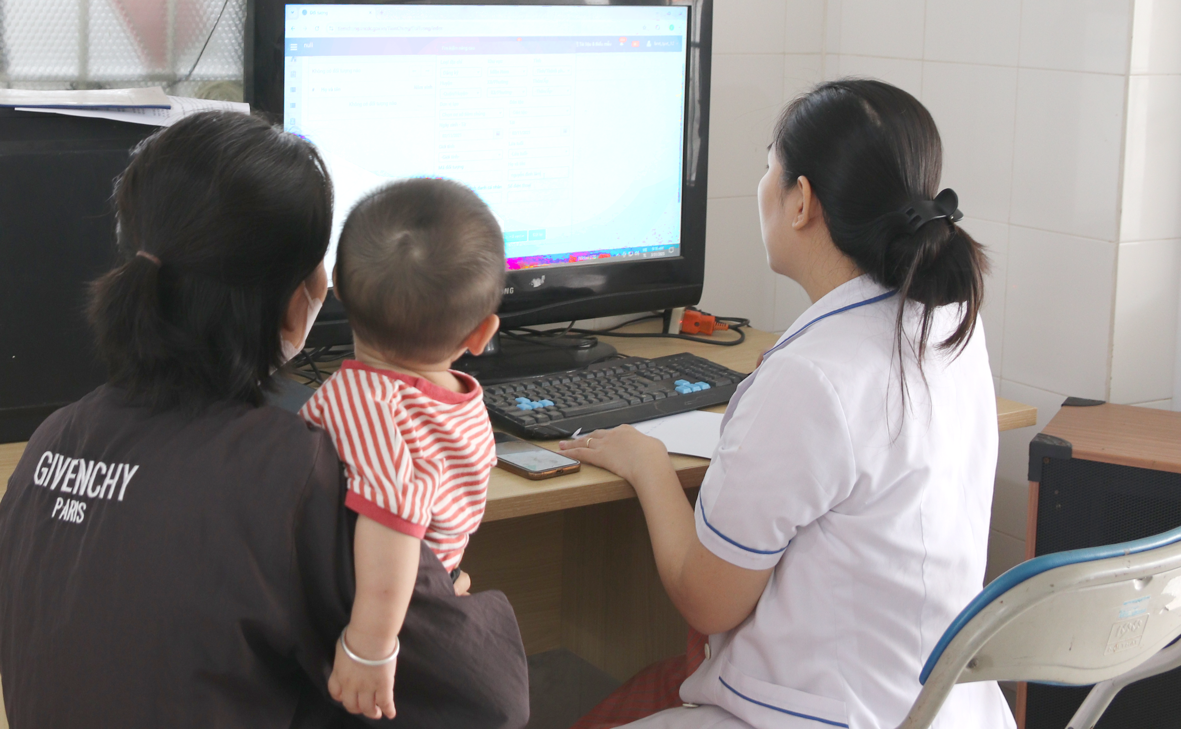 Ảnh: Cán bộ y tế thực hiện nhập thông tin tiêm chủng của trẻ trên Hệ thống thông tin tiêm chủng Quốc gia tại điểm trạm của phường Phước Thắng, Thành phố Hồ Chí Minh