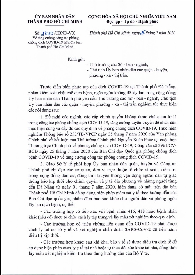 Công văn về tăng cường công tác phòng, chống dịch Covid-19 trên địa bàn Thành phố Hồ Chí Minh