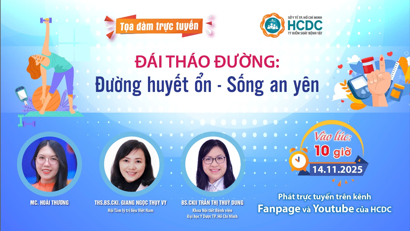 Chỉ còn 2 giờ nữa, buổi tọa đàm trực tuyến “Đái tháo đường: Đường huyết ổn – Sống an yên” sẽ chính thức lên sóng trên Fanpage và YouTube của Trung tâm Kiểm soát bệnh tật Thành phố Hồ Chí Minh vào lúc 10 giờ sáng hôm nay, Thứ Sáu, ngày 14/11/2025.
