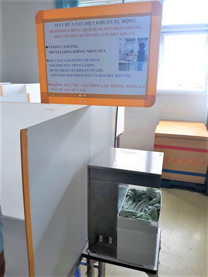 Ảnh: Máy rửa tay diệt khuẩn tự động được lắp tại công ty Furukawwa Automotive Parts, công nhân thực hiện rửa tay trước khi ăn