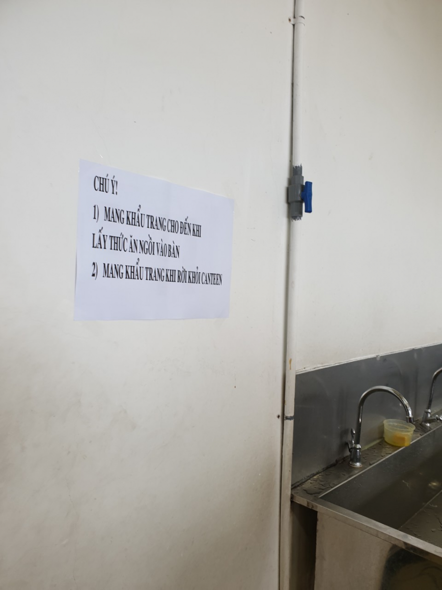 Ảnh: lời nhắc nhở công nhân chỉ tháo khẩu trang khi ngồi vào bàn ăn.