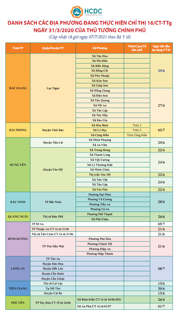 DANH SÁCH CÁC ĐỊA PHƯƠNG ĐANG THỰC HIỆN CHỈ THỊ 16/CT-TTg NGÀY 31/3/2020 CỦA THỦ TƯỚNG CHÍNH PHỦ (Cập nhật 18 giờ ngày 07/7/2021 theo Bộ Y tế)