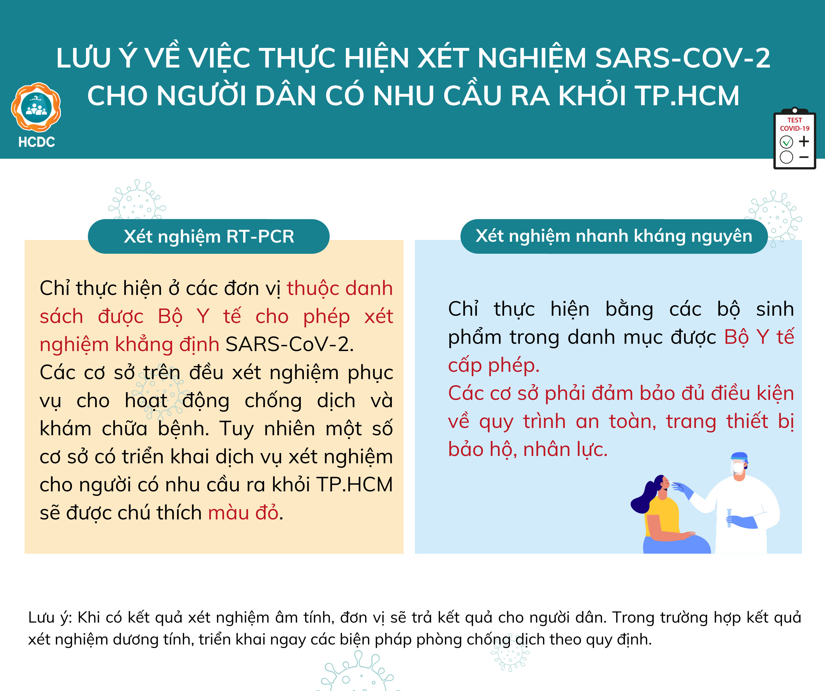 Khi có nhu cầu rời khỏi thành phố cần thực hiện xét nghiệm SARS-CoV-2, người dân có thể liên hệ các bệnh viện để được xét nghiệm nhanh kháng nguyên hoặc phòng xét nghiệm của các đơn vị được Bộ Y tế cho phép xét nghiệm khẳng định SARS-CoV-2.
