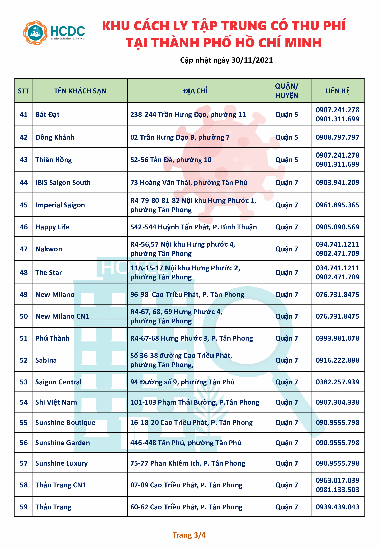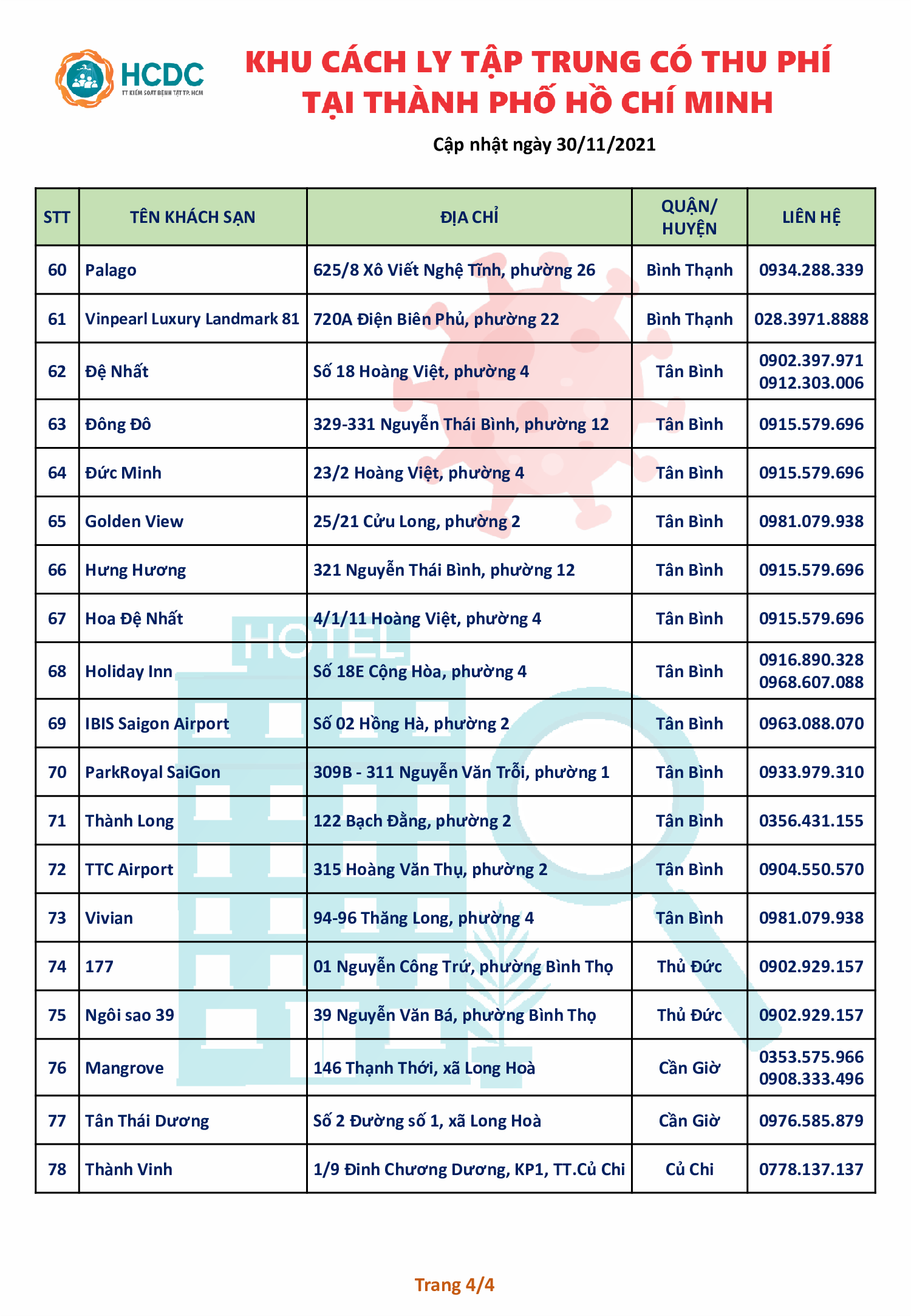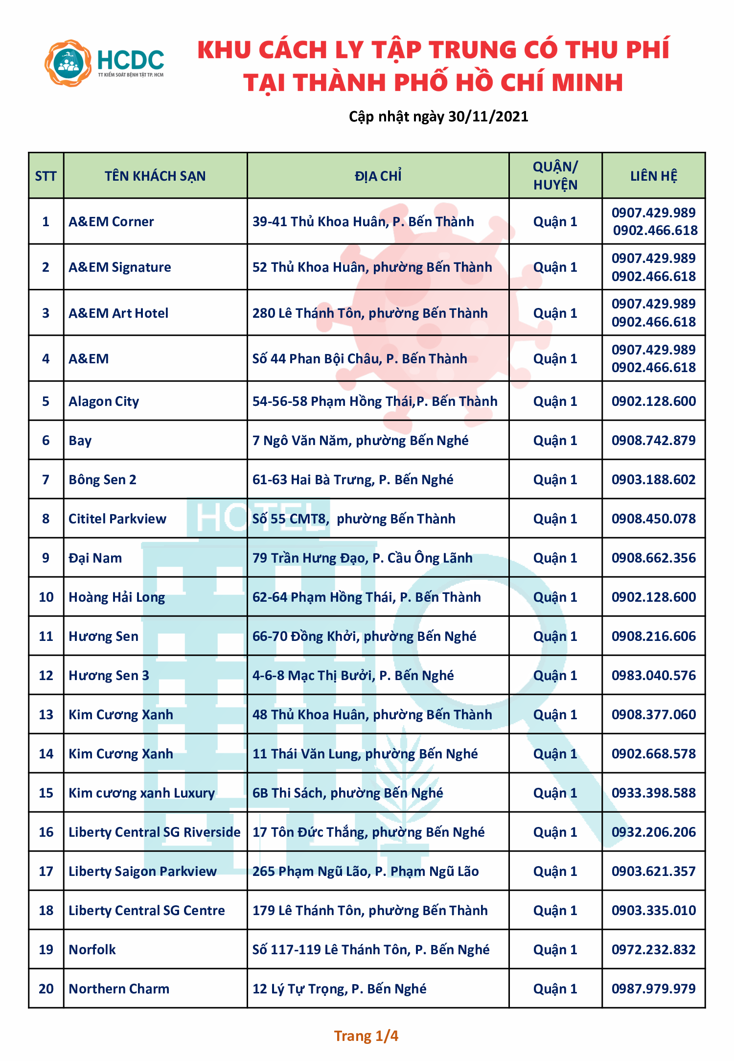 Danh sách các khu cách ly tập trung có thu phí tại Thành phố Hồ Chí Minh (cập nhật ngày 30/11/2021)