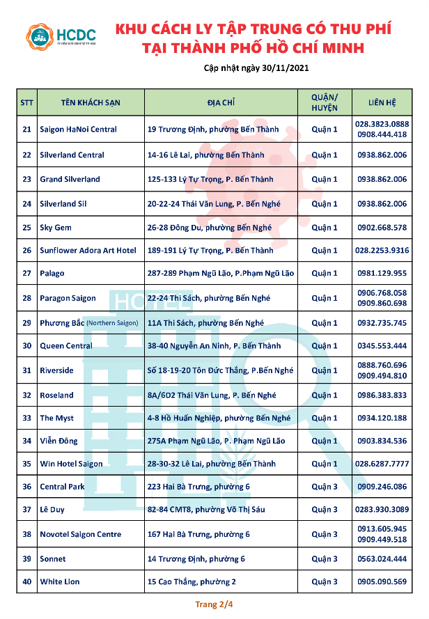 Nhằm tránh quá tải cho các khu cách ly tập trung và tạo sự thoải mái trong việc cách ly y tế, TP.HCM đã triển khai các khu cách ly tập trung có thu phí tại khách sạn dành cho đối tượng chuyên gia nhập cảnh, người tiếp xúc gần (F1) người nhiễm bệnh COVID-19. Chuyên gia nhập cảnh/người tiếp xúc gần có thể tham khảo danh sách các khu cách ly có thu phí được cập nhật dưới đây và chủ động liên hệ khi có nhu cầu cách ly.
