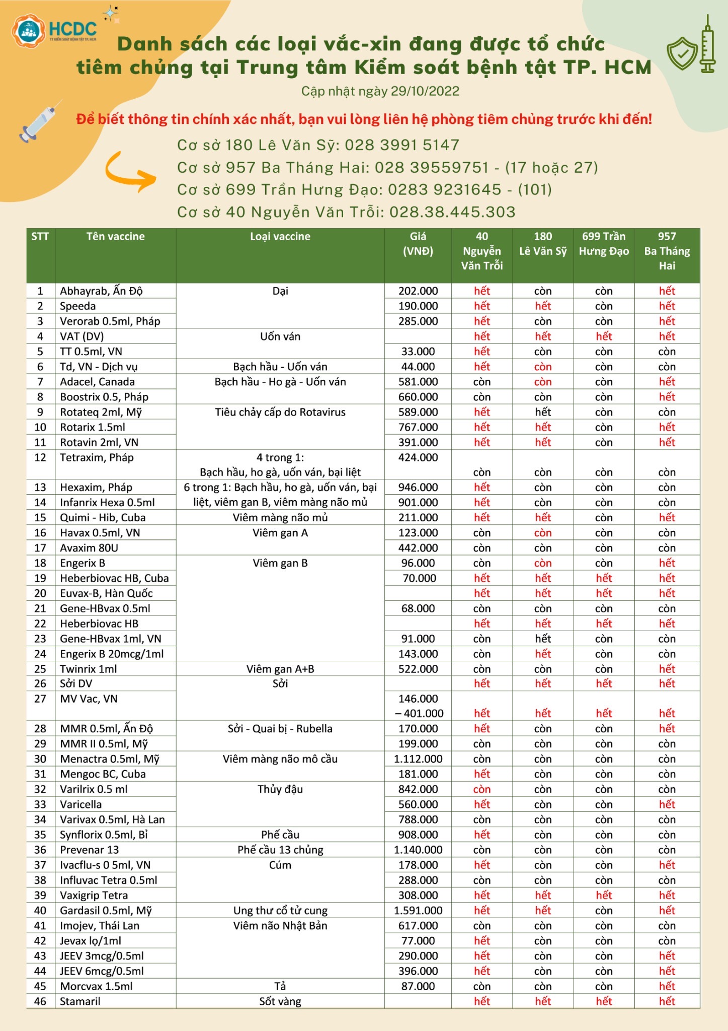 Danh sách các loại vắc-xin đang được tổ chức tiêm chủng tại Trung tâm Kiểm soát bệnh tật TP. Hồ Chí Minh (cập nhật 8:00 giờ ngày 29/10/2022)