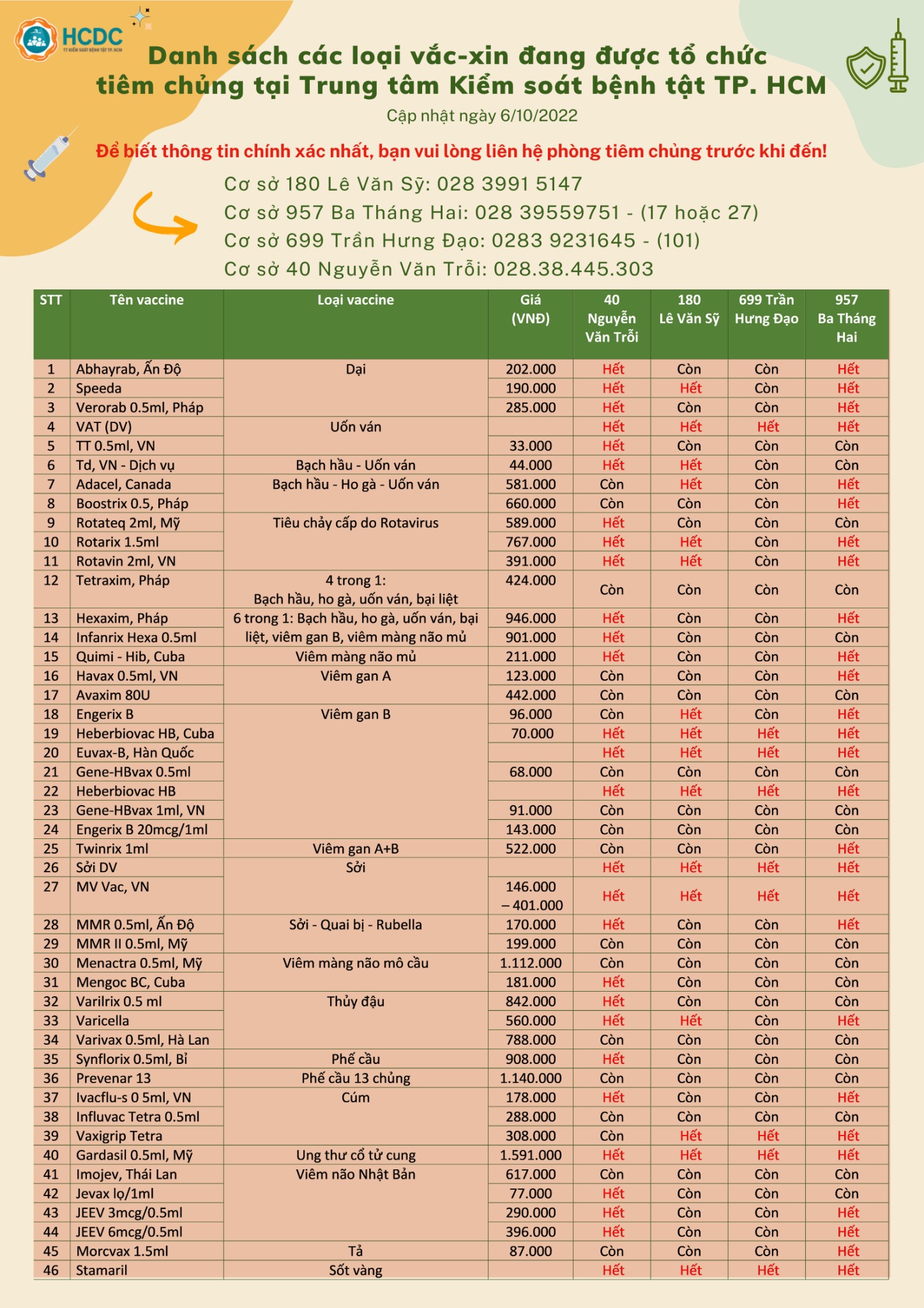 Danh sách các loại vắc-xin đang được tổ chức tiêm chủng tại Trung tâm Kiểm soát bệnh tật TP. Hồ Chí Minh (cập nhật 8:00 giờ ngày 6/10/2022)