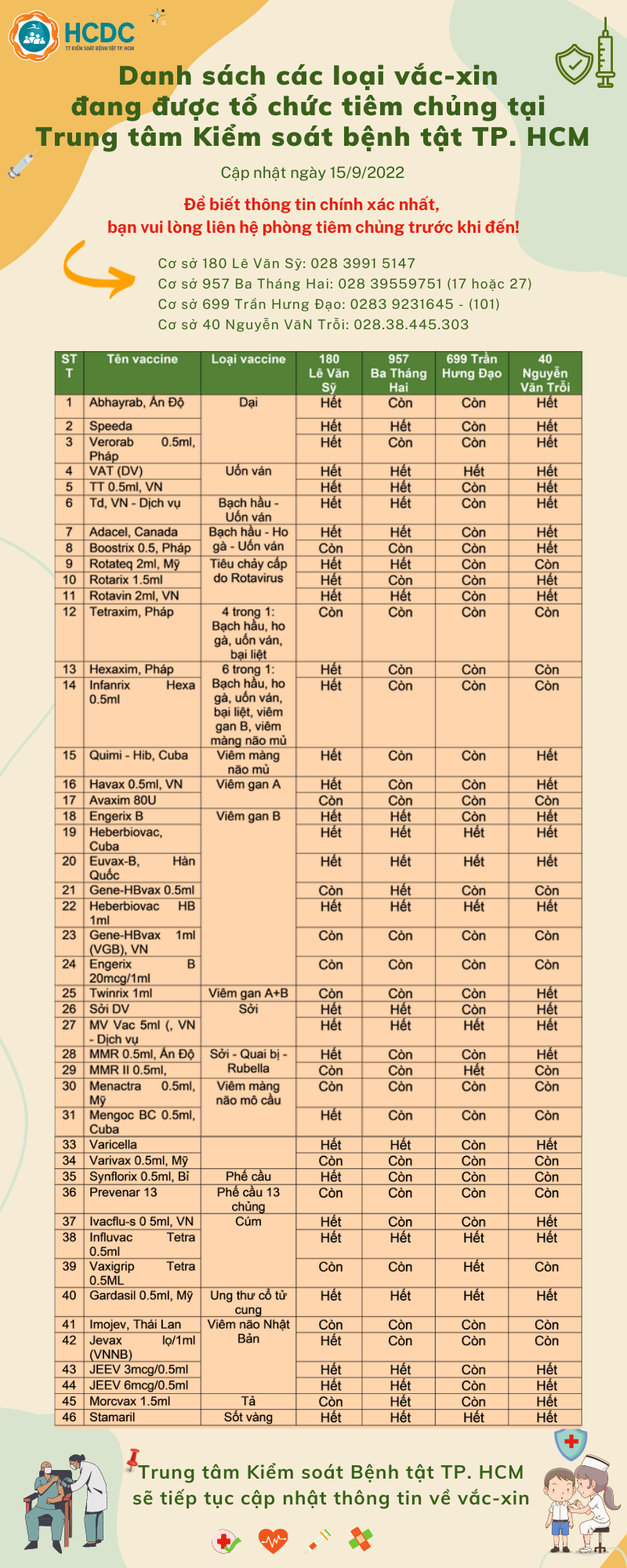Danh sách các loại vắc-xin đang được tổ chức tiêm chủng tại Trung tâm Kiểm soát bệnh tật TP. Hồ Chí Minh (cập nhật 8:30 giờ ngày 15/9/2022)