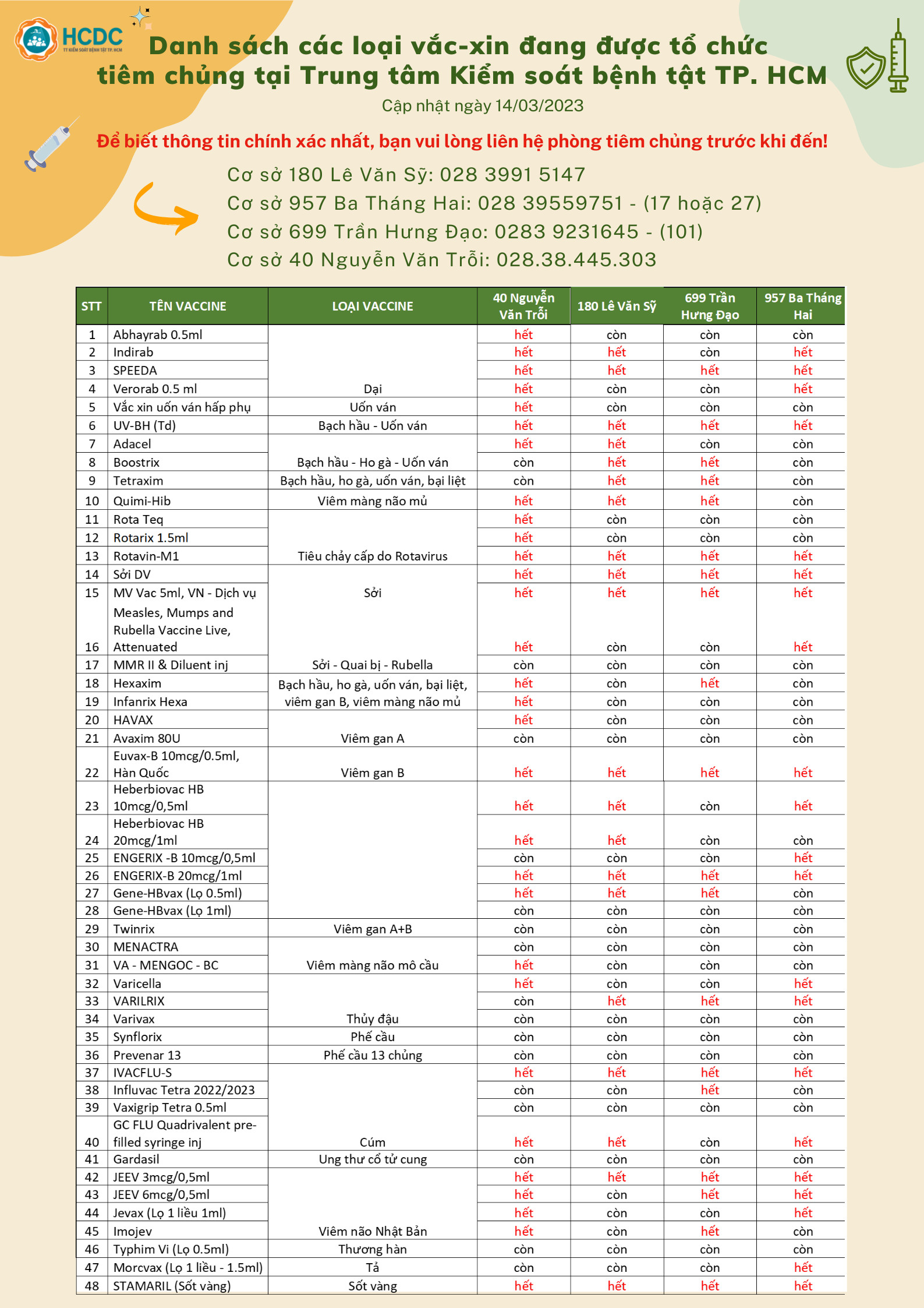 Danh sách các loại vắc-xin đang được tổ chức tiêm chủng tại Trung tâm Kiểm soát bệnh tật TP. Hồ Chí Minh (Ngày 14/03/2023)( cập nhật 10 giờ 30)