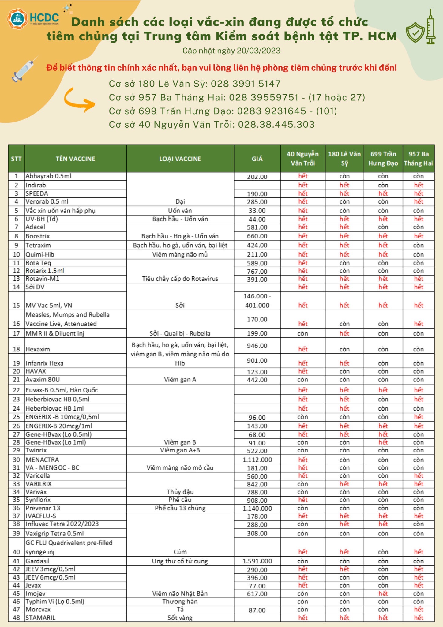 Danh sách các loại vắc-xin đang được tổ chức tiêm chủng tại Trung tâm Kiểm soát bệnh tật TP. Hồ Chí Minh (Ngày 20/03/2023)