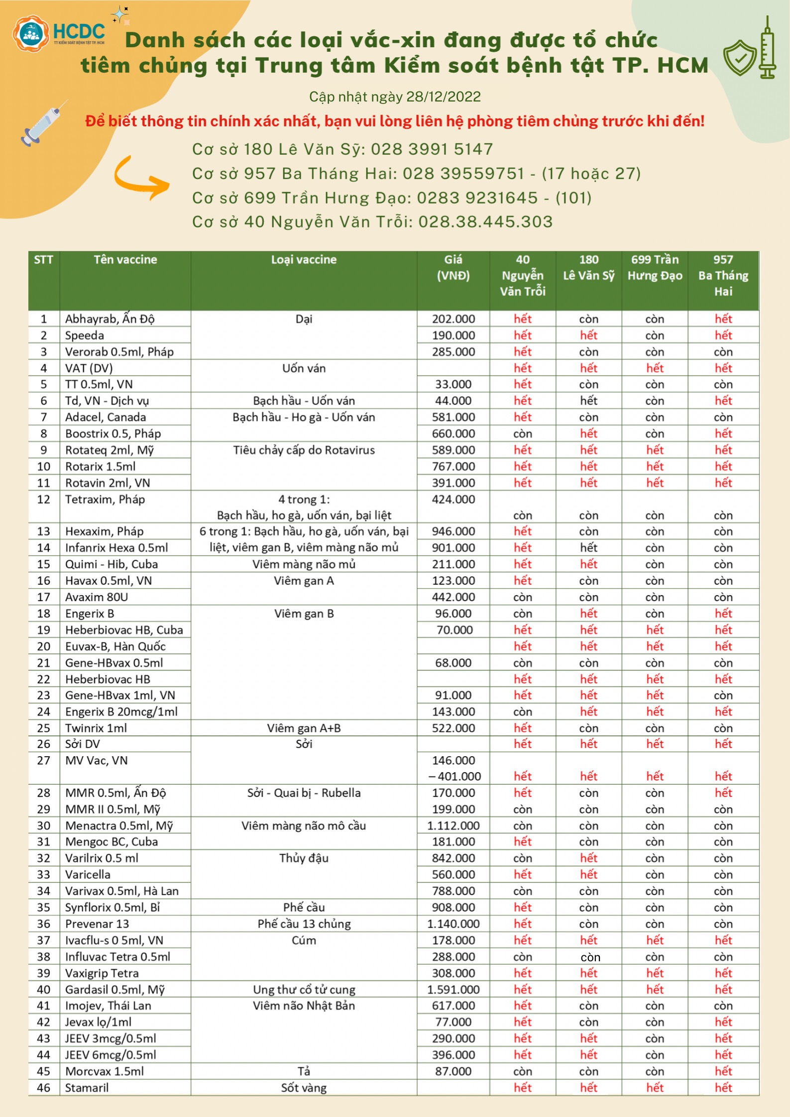 Danh sách các loại vắc-xin đang được tổ chức tiêm chủng tại Trung tâm Kiểm soát bệnh tật TP. Hồ Chí Minh (Ngày 28/12/2022)