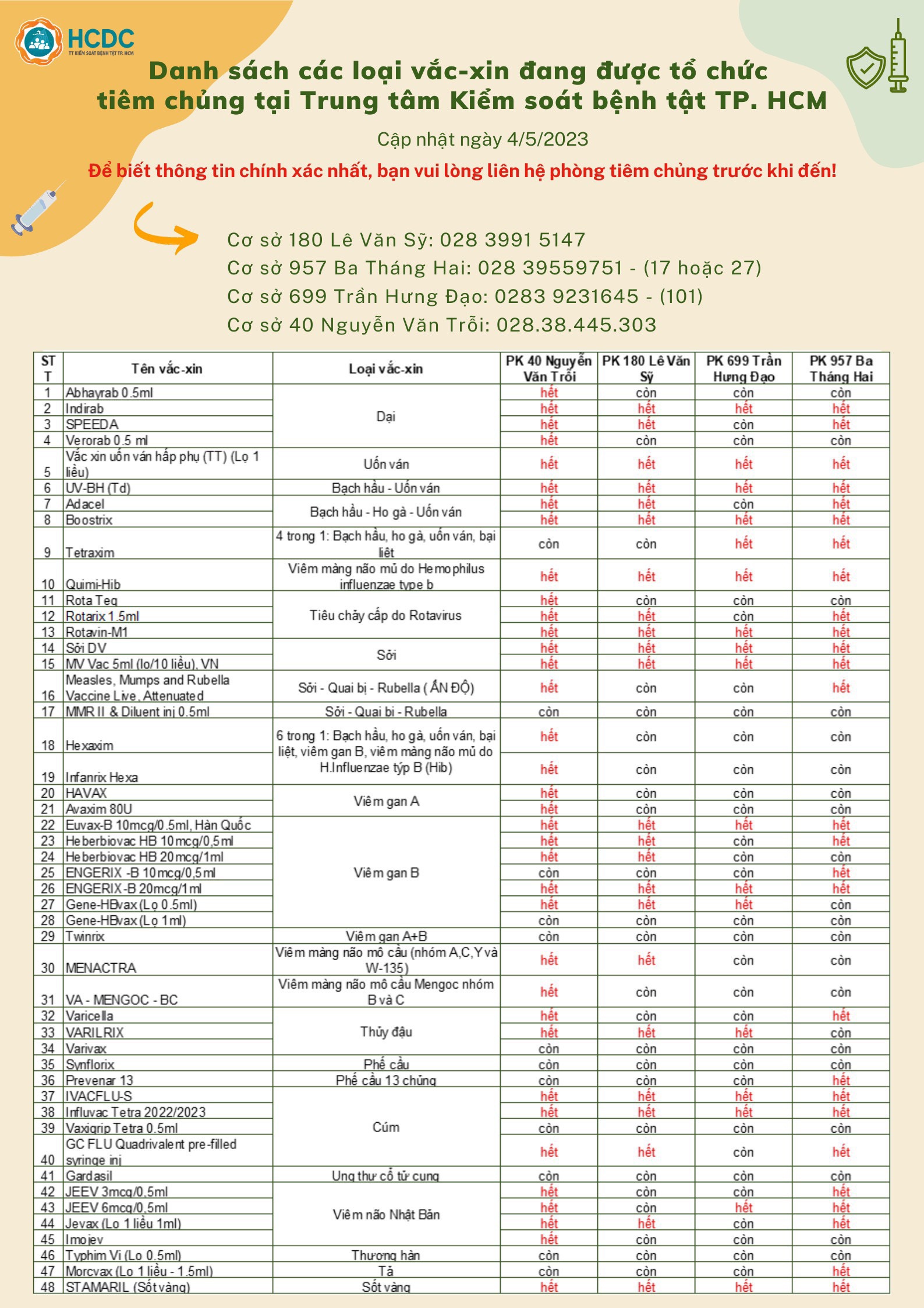 Danh sách các loại vắc-xin đang được tổ chức tiêm chủng tại Trung tâm Kiểm soát bệnh tật TP. Hồ Chí Minh (Ngày 4/5/2023)