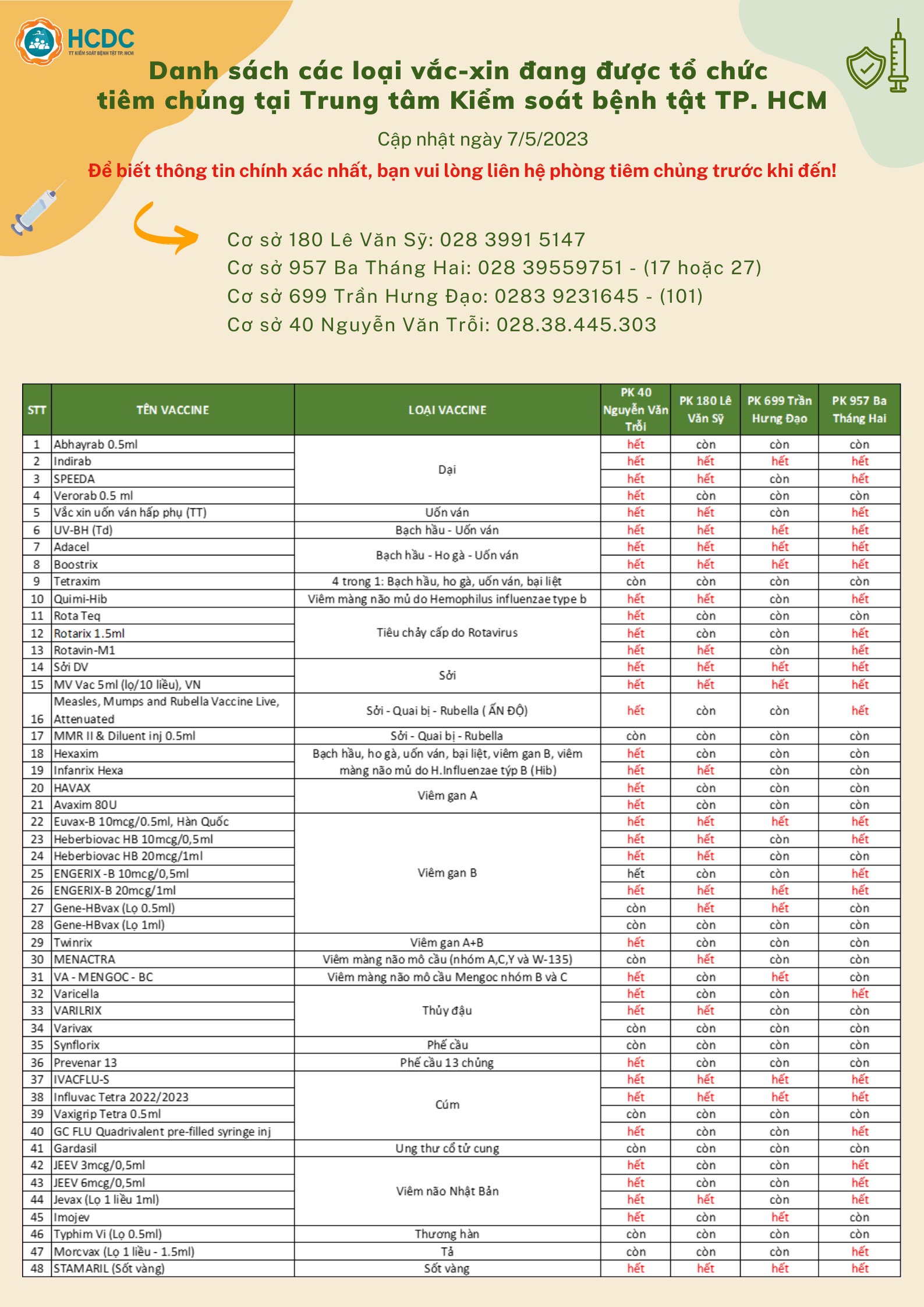 Danh sách các loại vắc-xin đang được tổ chức tiêm chủng tại Trung tâm Kiểm soát bệnh tật TP. Hồ Chí Minh (Ngày 7/5/2023)