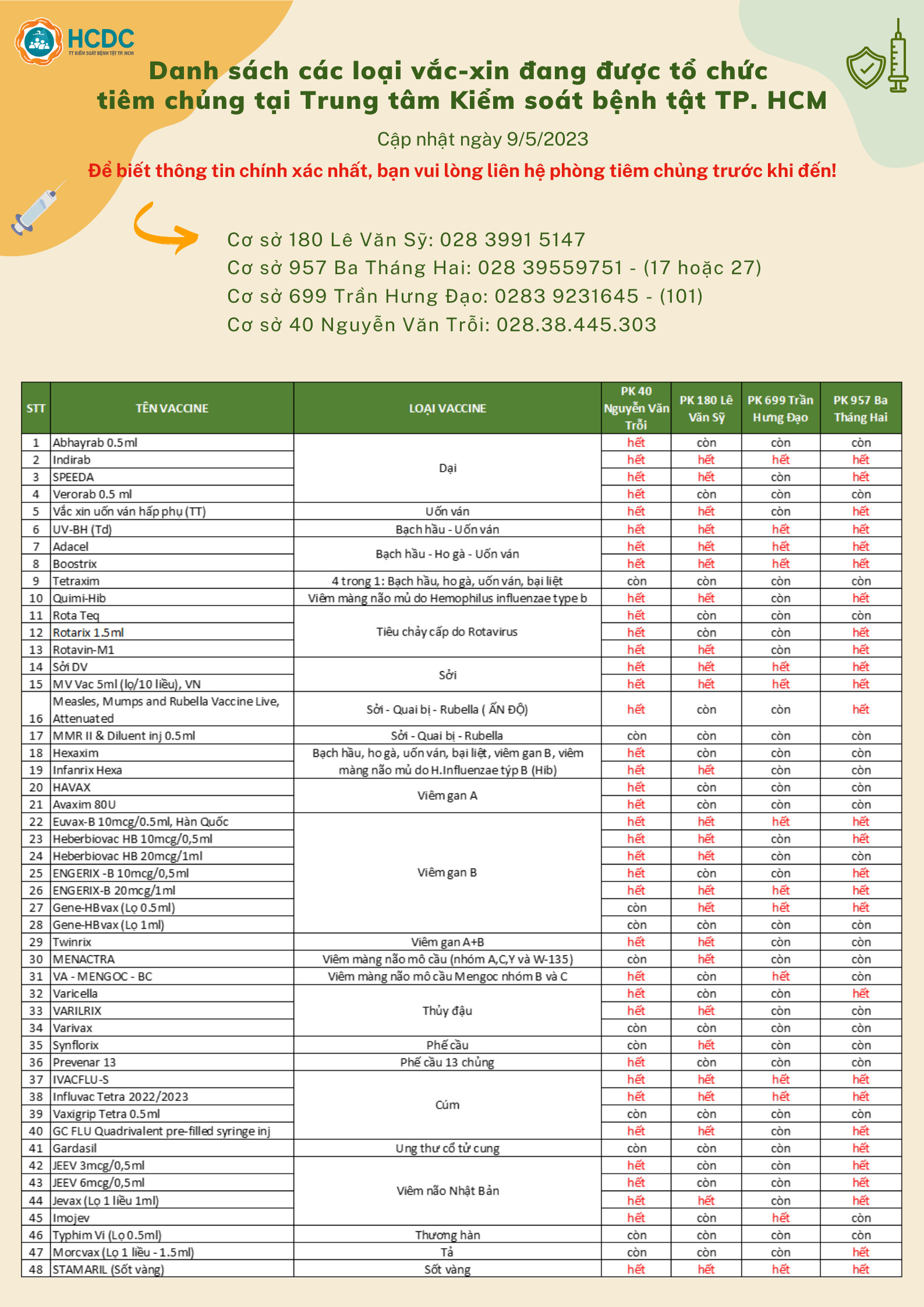 Danh sách các loại vắc-xin đang được tổ chức tiêm chủng tại Trung tâm Kiểm soát bệnh tật TP. Hồ Chí Minh (Ngày 9/5/2023)