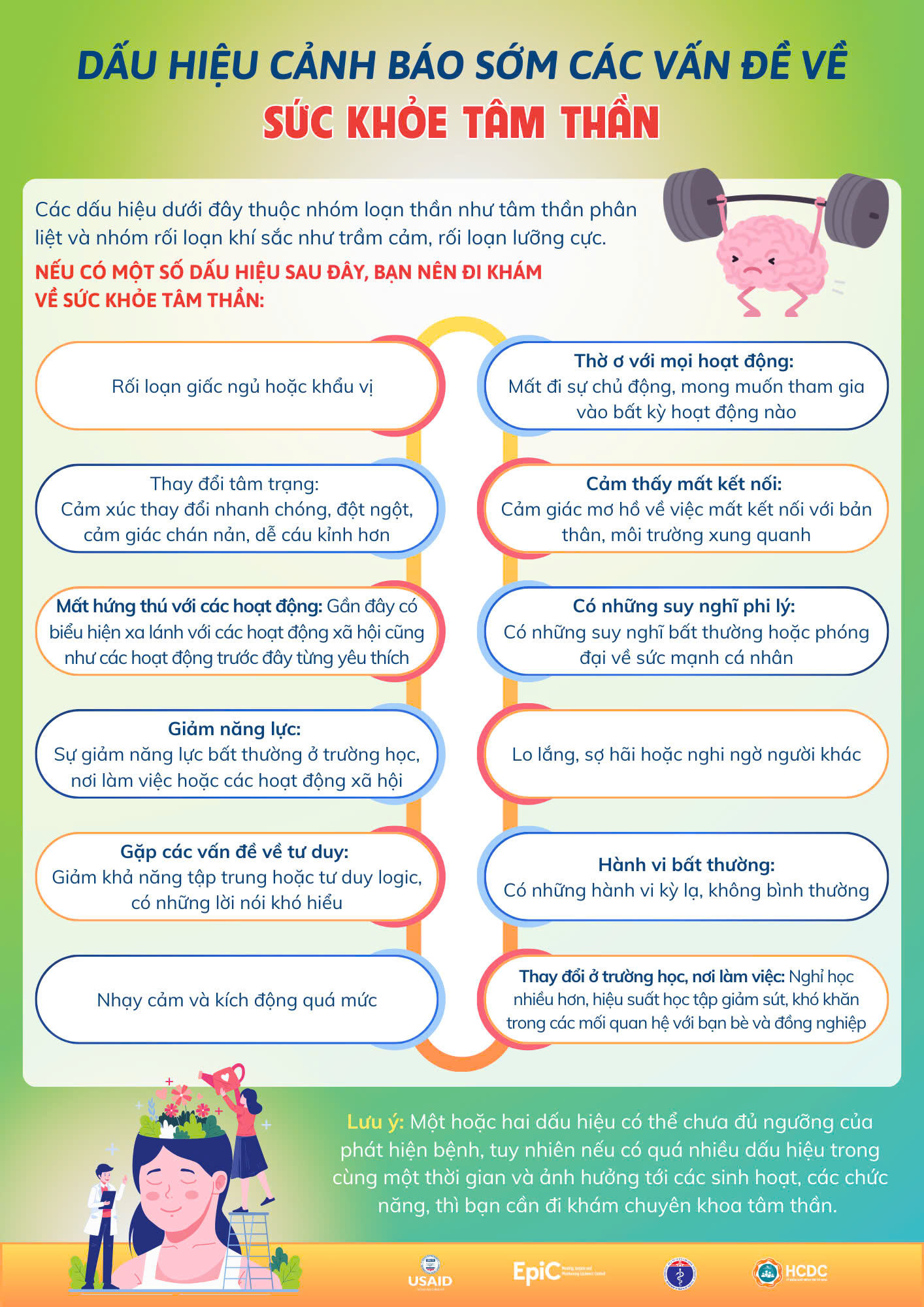 Việc phát hiện các triệu chứng cảnh báo sớm liên quan đến vấn đề về sức khỏe tâm thần có thể giúp đảm bảo điều trị kịp thời. Can thiệp sớm có thể giúp giảm mức độ nghiêm trọng của bệnh, thậm chí có thể trì hoãn hoặc ngăn ngừa hoàn toàn một căn bệnh tâm thần nghiêm trọng.