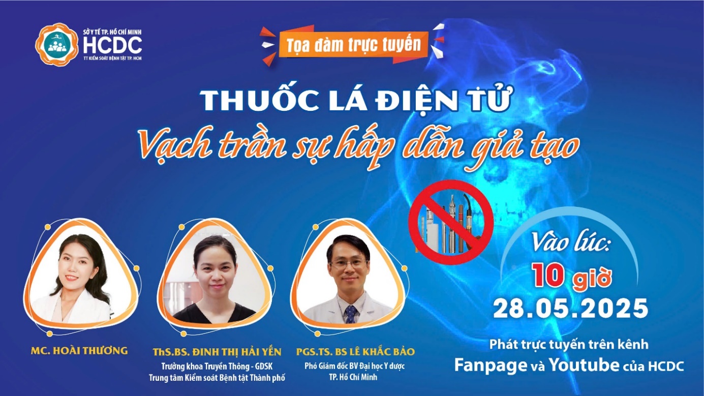 Tọa đàm sẽ được phát sóng trực tuyến trên Fanpage vàYoutube của Trung tâm Kiểm soát bệnh tật Thành phốvào lúc 10h sáng hôm nay - Thứ Tư, ngày 28/5/2025. Tham gia buổi trò chuyện có sự góp mặt của các chuyên gia y tế nhiều kinh nghiệm - người truyền cảm hứng, cùng những câu chuyện cảnh tỉnh từ người thật -việc thật.
