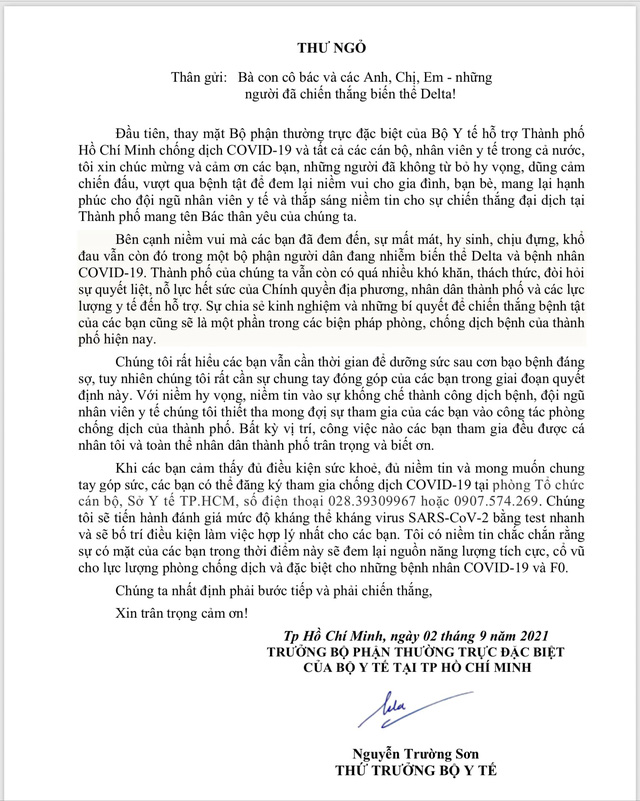 Ngày 2/9, tại TP.HCM, Thứ trưởng Bộ Y tế Nguyễn Trường Sơn gửi bức thư ngỏ tới những người đã chiến thắng biến thể Delta.