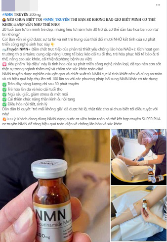 Dù chưa được cấp phép, hoạt chất NMN hay công nghệ tiêm NAD+ vẫn được rao bán rầm rộ trên mạng xã hội và các cơ sở làm đẹp.