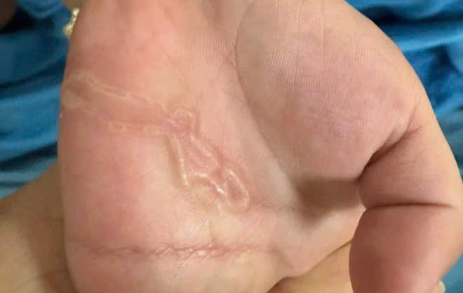 Chỉ vài ngày sau khi chơi cát và bị sứt nhẹ ở kẽ ngón tay, bàn tay trẻ xuất hiện các đường “xuất hiện” các đường uốn lượn bất thường