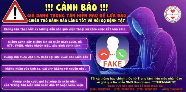 Sở Y tế TPHCM cảnh báo thủ đoạn giả mạo nhân viên y tế gọi điện lừa người hiến máu yêu cầu cung cấp hình ảnh căn cước công dân, tài khoản VNeID, kết bạn Zalo để 'hướng dẫn đăng ký khám, làm xét nghiệm hoặc xác minh danh tính.