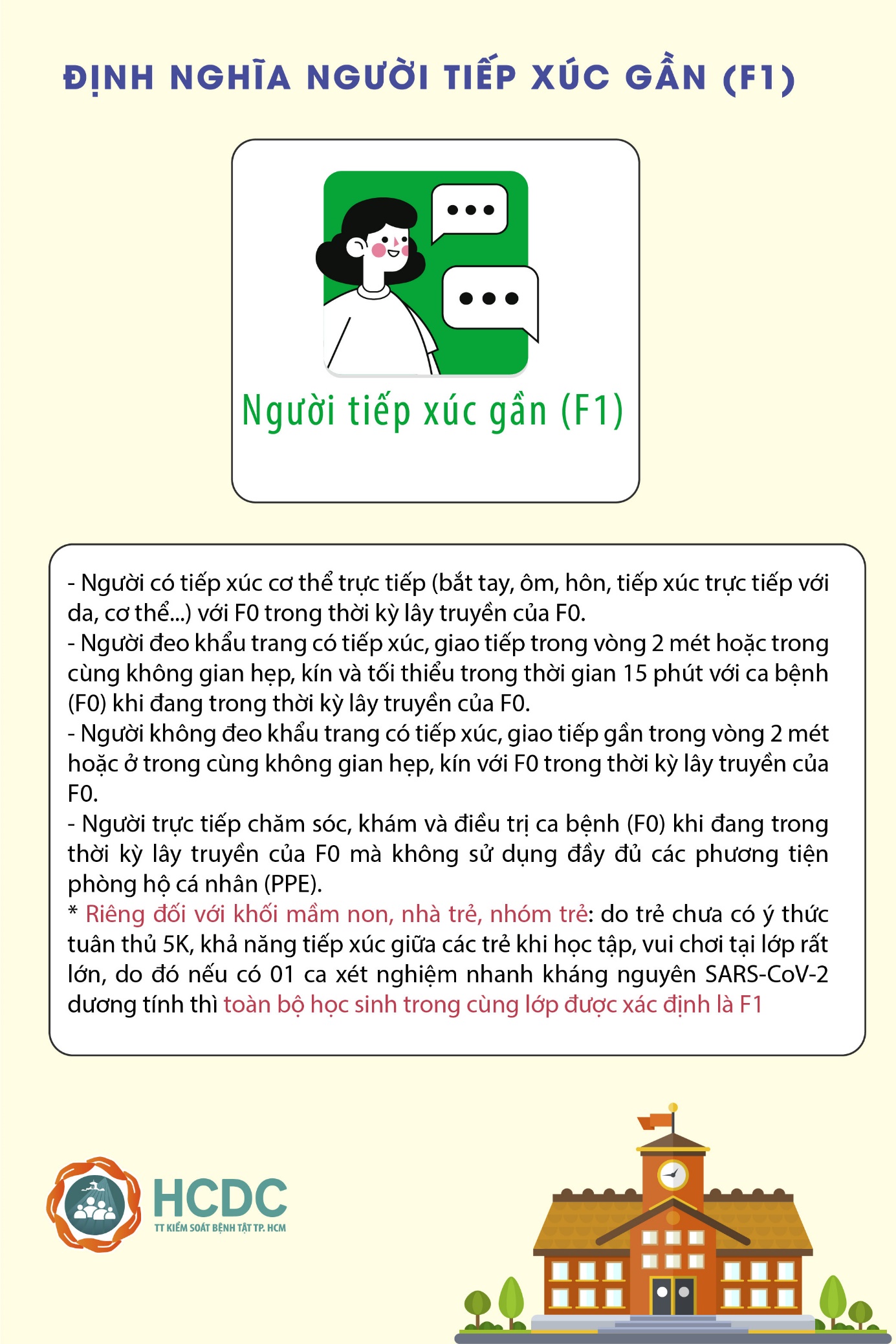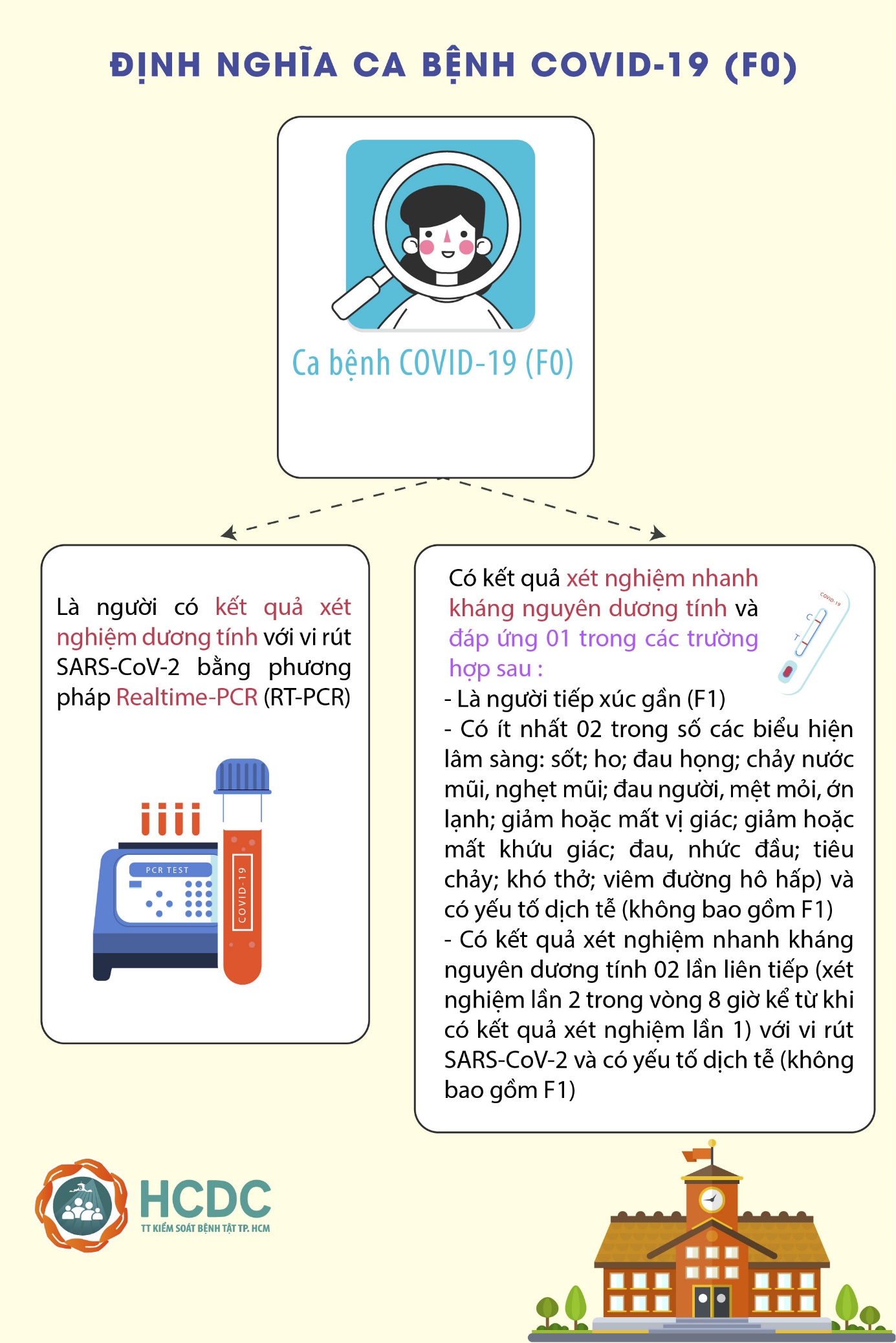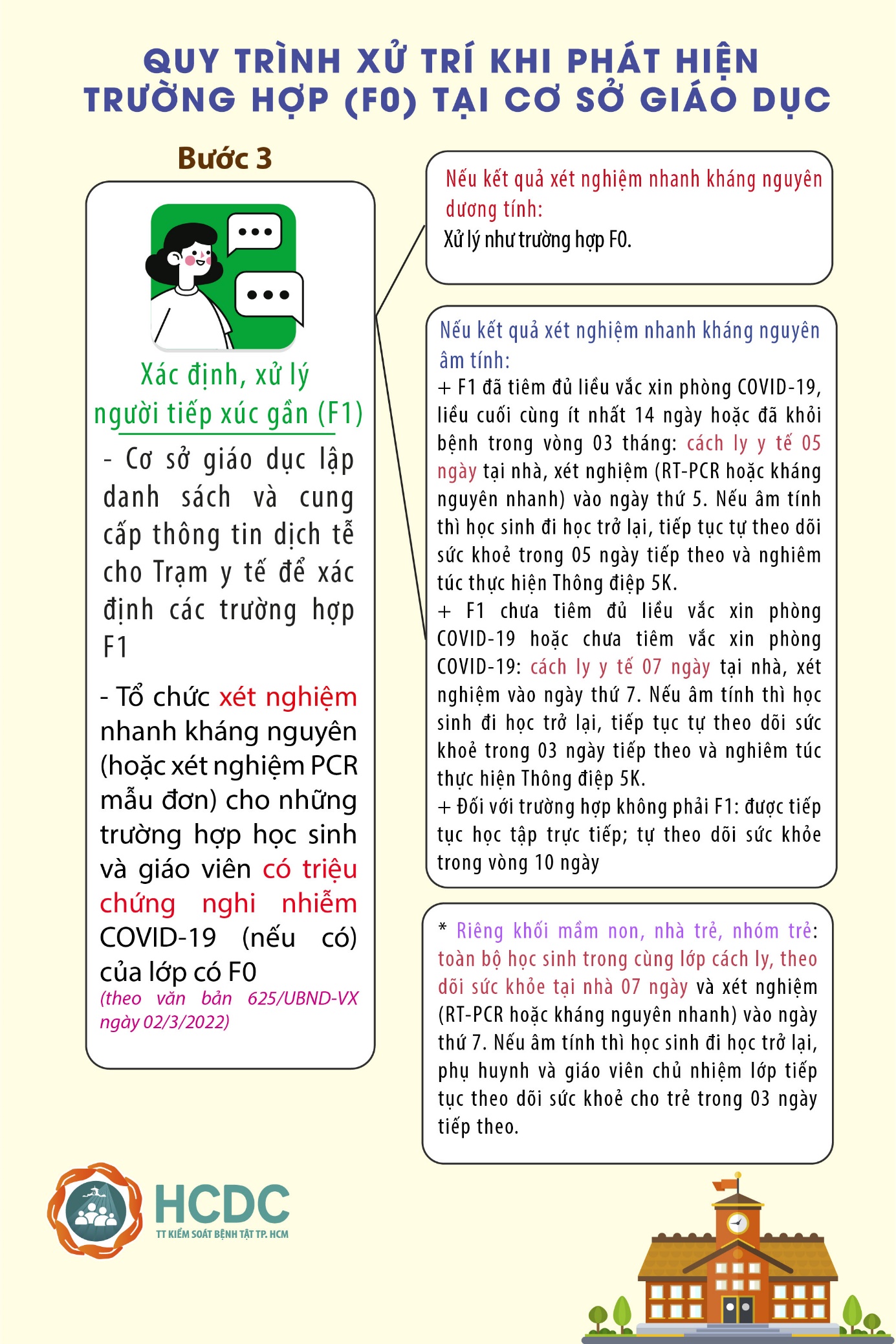 Theo điều chỉnh, sau khi phát hiện trường hợp F0 tại cơ sở giáo dục và đã thực hiện lập danh sách các trường hợp tiếp xúc gần F1, Trạm Y tế cấp xã hoặc cơ sở y tế phối hợp với cơ sở giáo dục tổ chức xét nghiệm nhanh kháng nguyên (hoặc xét nghiệm RT-PCR mẫu đơn) cho những trường hợp học sinh, giáo viên có triệu chứng nghi nhiễm Covid-19 (nếu có) của lớp có F0. Nếu kết quả âm tính thì thực hiện cách ly y tế tại nhà theo quy định.
