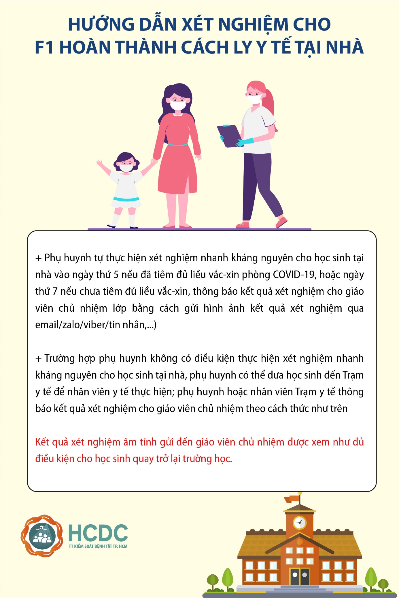 Sau khi cách ly, phụ huynh tự thực hiện xét nghiệm nhanh kháng nguyên cho học sinh tại nhà vào ngày thứ 5 nếu đã tiêm đủ liều vắc-xin phòng COVID-19, hoặc ngày thứ 7 nếu chưa tiêm đủ liều vắc-xin, thông báo kết quả xét nghiệm cho giáo viên chủ nhiệm lớp bằng cách gửi hình ảnh kết quả xét nghiệm (qua email, zalo, viber, tin nhắn).