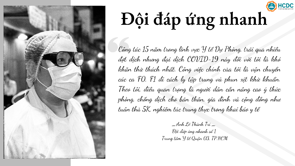 Tôi may mắn có dịp nhìn thấy những bức ảnh trắng đen của các anh chị thuộc Đội đáp ứng nhanh - Trung tâm Y tế (TTYT) Quận 3, TP.HCM qua ống kính của một người anh khóa trên. Những bức ảnh được ghi lại khi các anh chị thực hiện nhiệm vụ tại các điểm dịch trên địa bàn Quận 3 trong làn sóng dịch lần thứ 4 này. Đội đáp ứng nhanh là một trong những đội có mặt nhanh nhất tại hiện trường khi có ca nghi nhiễm hoặc nhiễm COVID-19 mà chúng ta vẫn thường thấy trên các mặt báo hay thậm chí là chính nơi chúng ta đang sinh sống.