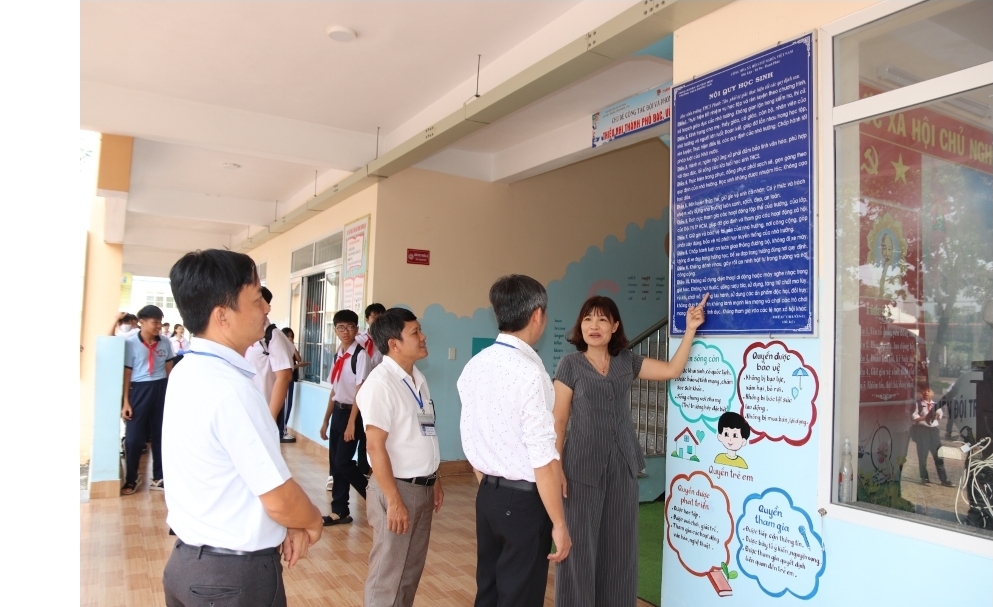 Ảnh: Giám sát việc niêm yết quy định cấm hút thuốc tại trường học THCS Phước Tân, xã Hồ Tràm, TP. Hồ Chí Minh
