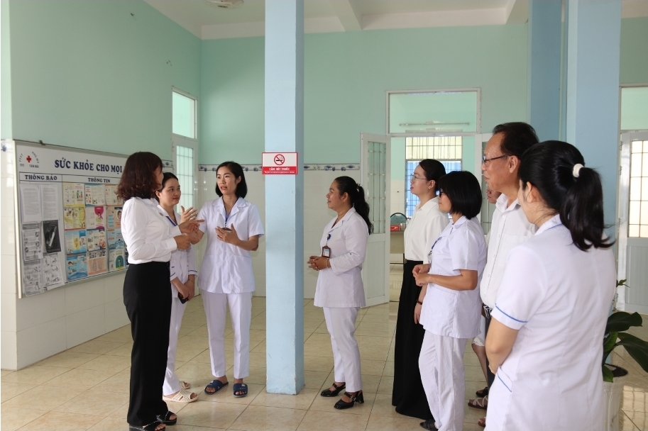 Ảnh: Tổ Giám sát số 2 của HCDC trao đổi với Trạm Y tế Tân Hải về giải pháp duy trì cơ sở y tế không thuốc lá.