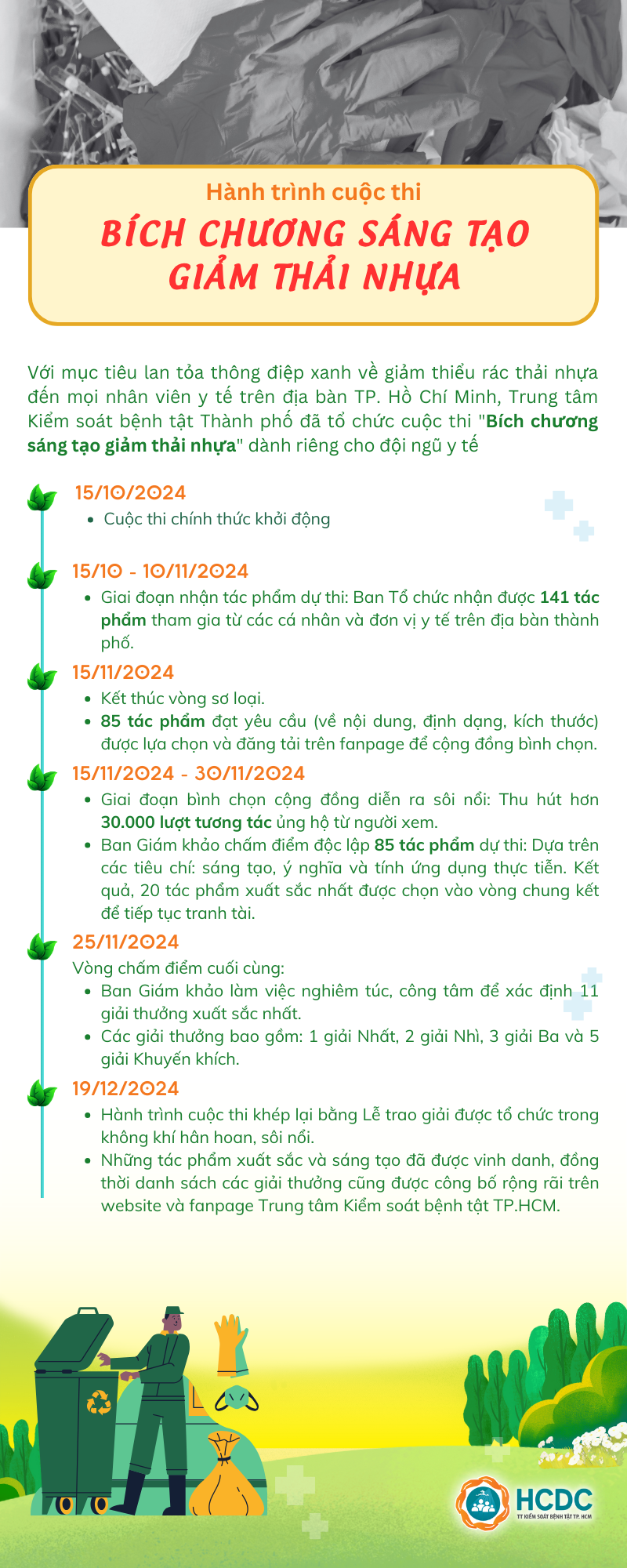 Với mục tiêu lan tỏa thông điệp xanh về giảm thiểu rác thải nhựa đến mọi nhân viên y tế trên địa bàn TP. Hồ Chí Minh, Trung tâm Kiểm soát bệnh tật Thành phố đã tổ chức cuộc thi "Bích chương sáng tạo giảm thải nhựa" dành riêng cho đội ngũ y tế. Đây không chỉ là sân chơi sáng tạo mà còn là cơ hội để nhân viên y tế thể hiện ý tưởng và giải pháp thực tiễn trong việc giảm thiểu chất thải nhựa tại cơ sở làm việc.