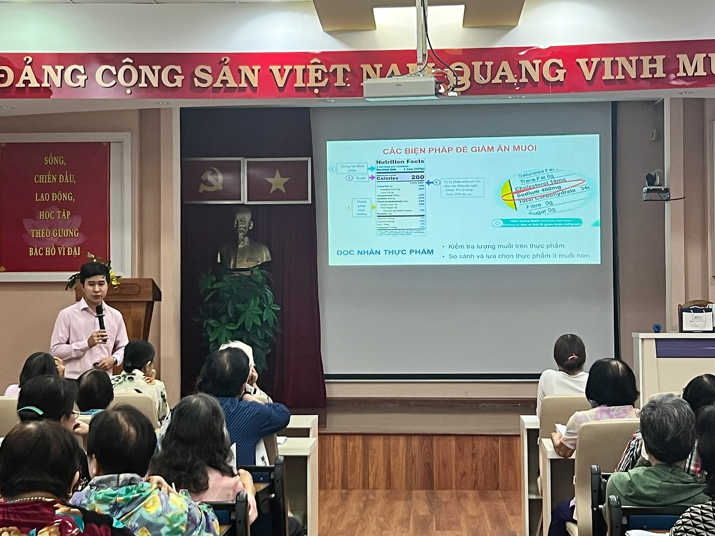 Ảnh: Ths. Bùi Hùng Mạnh chia sẻ những kiến thức bổ ích về các biện pháp để giảm ăn muối