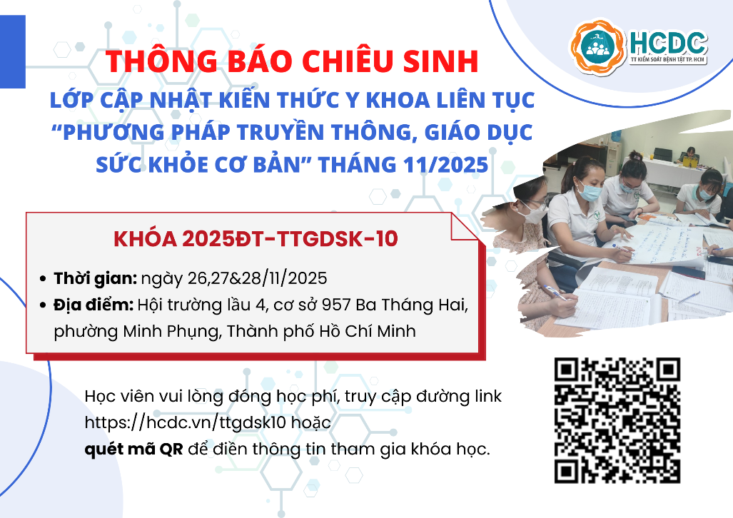 Trung tâm Kiểm soát bệnh tật Thành phố Hồ Chí Minh (HCDC) thông báo chiêu sinh lớp cập nhật kiến thức y khoa liên tục “Phương pháp truyền thông, giáo dục sức khỏe cơ bản” tháng 11/2025 dành cho nhân viên công tác trong lĩnh vực y tế, cộng tác viên y tế hoặc sinh viên các ngành truyền thông, y tế công cộng, công tác xã hội, xã hội học có nhu cầu.