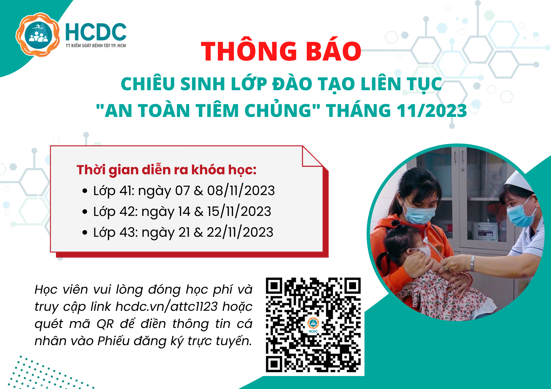 Trung tâm Kiểm soát bệnh tật Thành phố Hồ Chí Minh (HCDC) thông báo chiêu sinh lớp đào tạo liên tục “An toàn tiêm chủng” tháng 11/2023 dành cho nhân viên y tế tham gia hoạt động tiêm chủng hoặc nhân viên y tế có nhu cầu đào tạo liên tục về “An toàn tiêm chủng”.