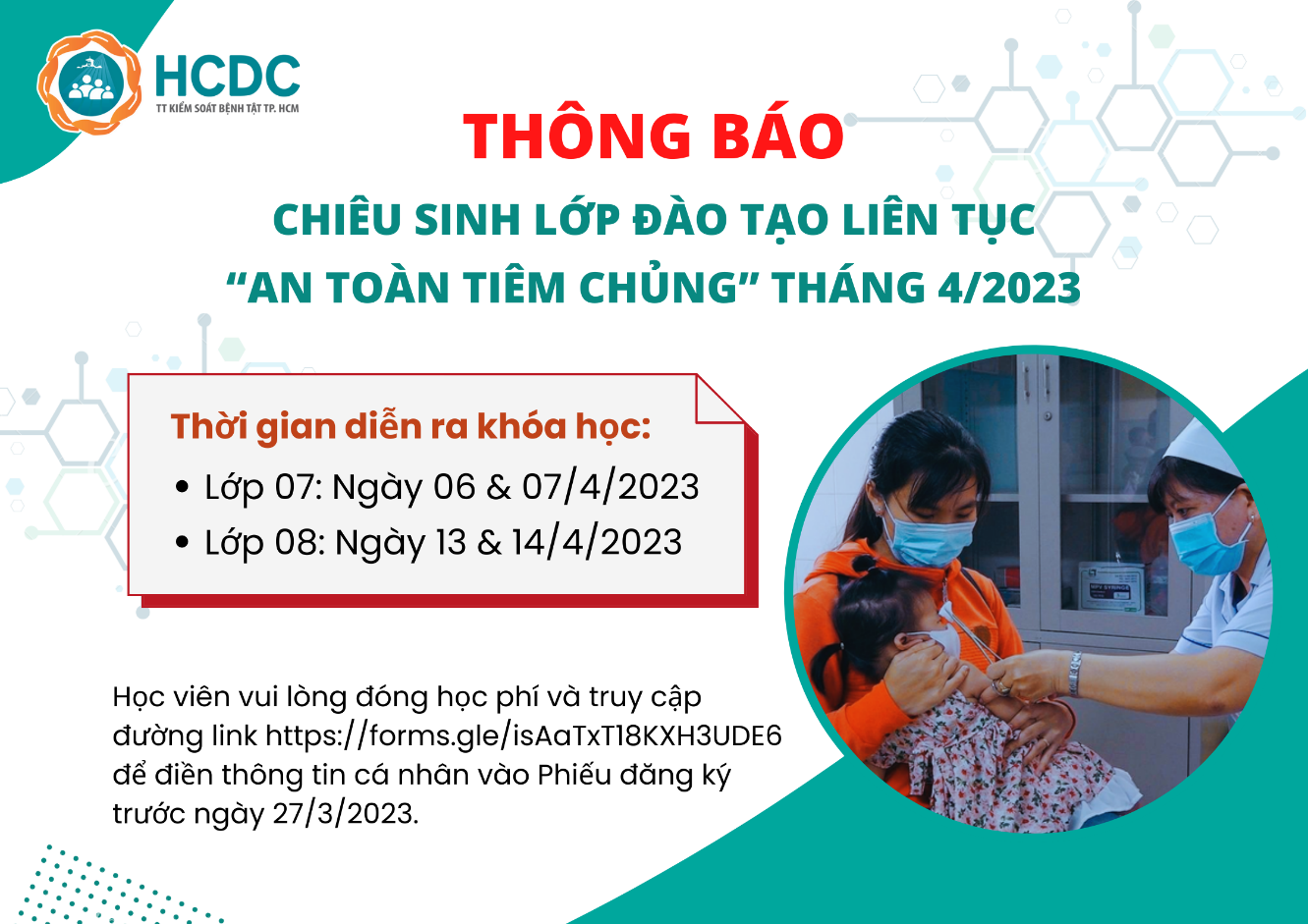 Trung tâm Kiểm soát bệnh tật Thành phố Hồ Chí Minh (HCDC) thông báo chiêu sinh lớp đào tạo liên tục “An toàn tiêm chủng” tháng 4/2023 dành cho nhân viên y tế tham gia hoạt động tiêm chủng hoặc nhân viên y tế có nhu cầu đào tạo liên tục về “An toàn tiêm chủng”.