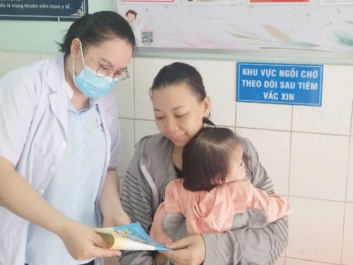 Ảnh: Phát tờ rơi về tiêm vắc xin phòng bệnh sởi cho phụ huynh đưa trẻ đến tiêm