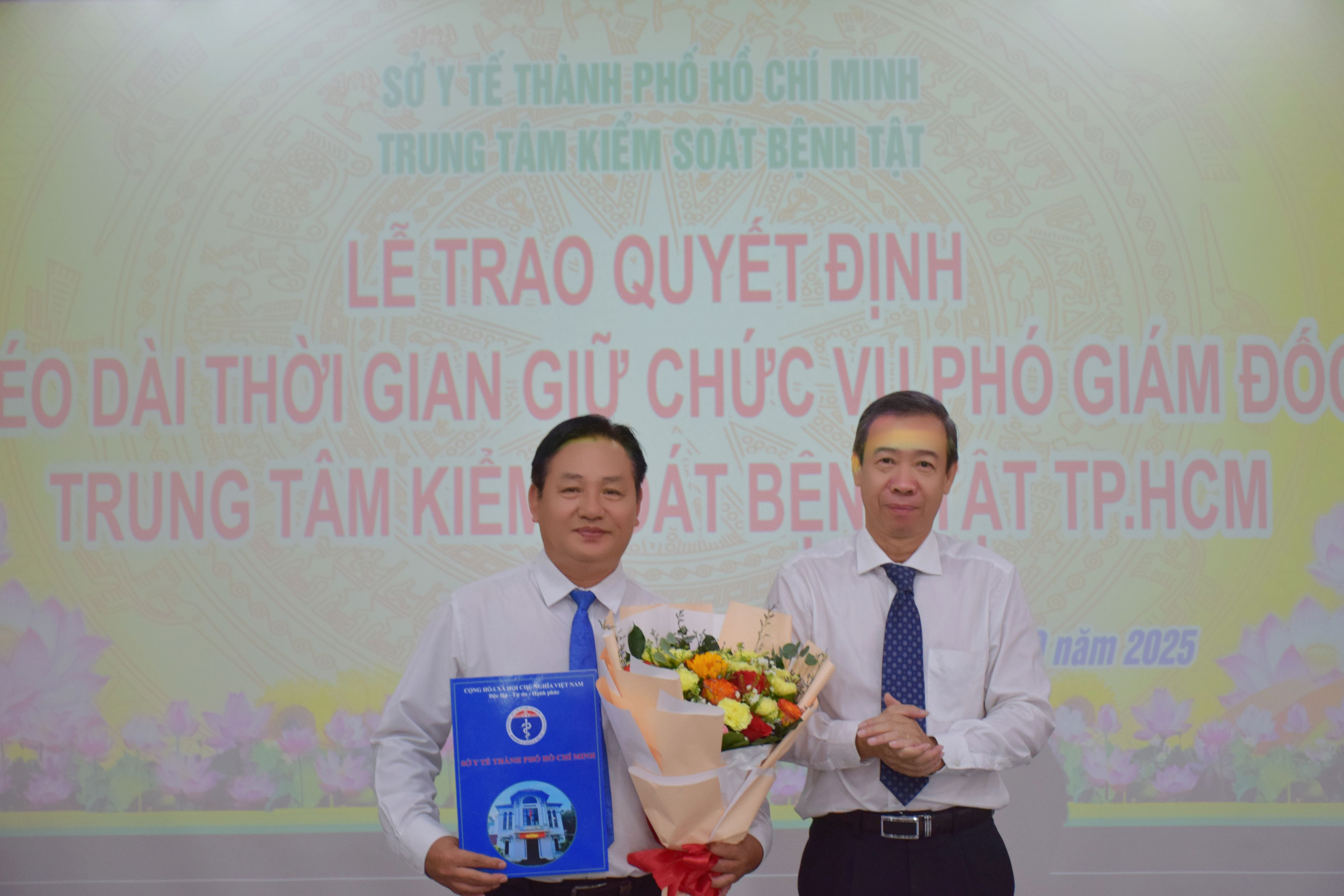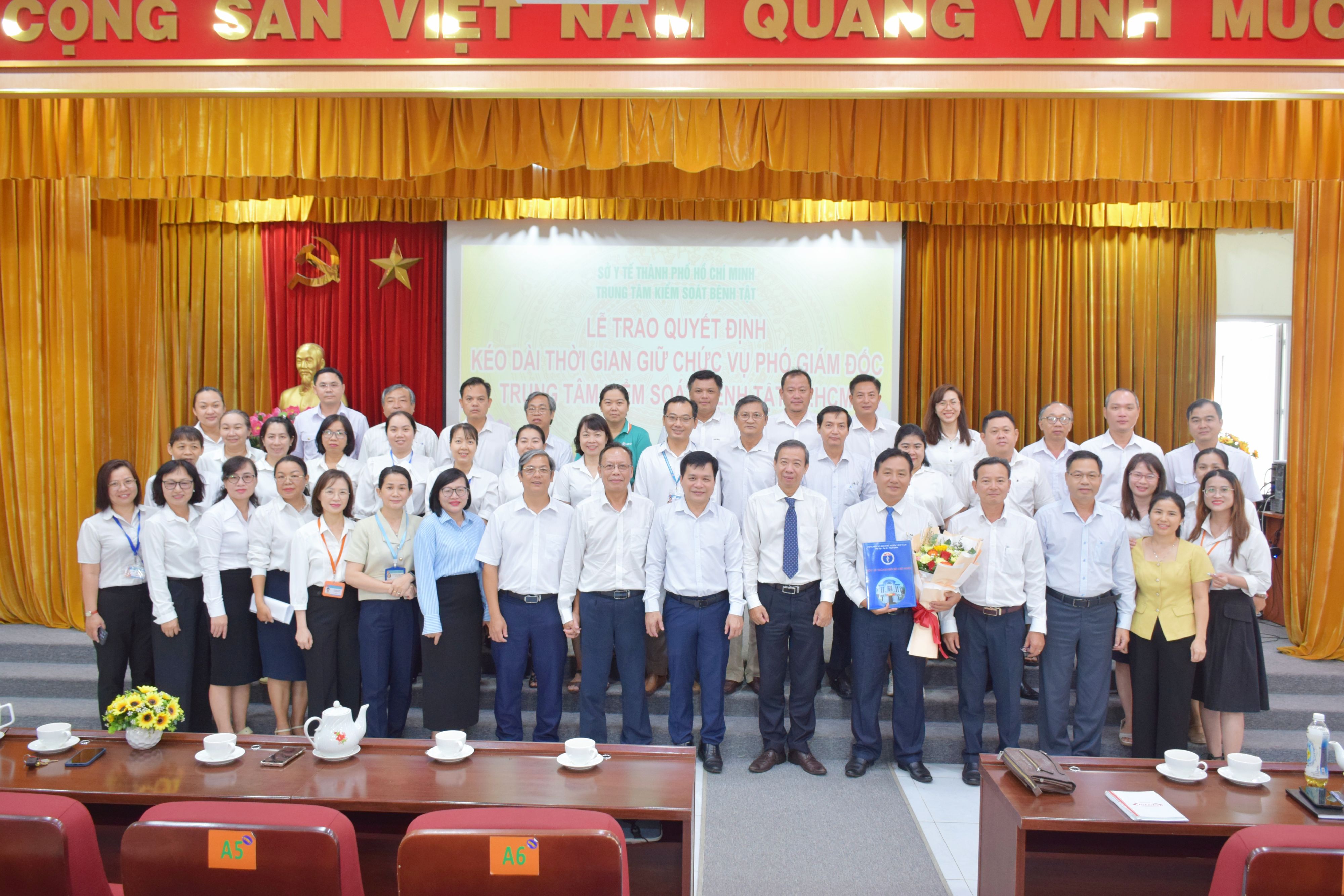 Lễ trao quyết định kéo dài thời gian giữ chức vụ Phó Giám đốc Trung tâm Kiểm soát bệnh tật Thành phố Hồ Chí Minh (HCDC) do TS.BS. Nguyễn Văn Vĩnh Châu - Phó Giám đốc Sở Y tế Thành phố Hồ Chí Minh chủ trì, với sự tham dự của đại diện Phòng Tổ chức – Cán bộ Sở Y tế, Ban Giám đốc cùng lãnh đạo các khoa, phòng thuộc HCDC.