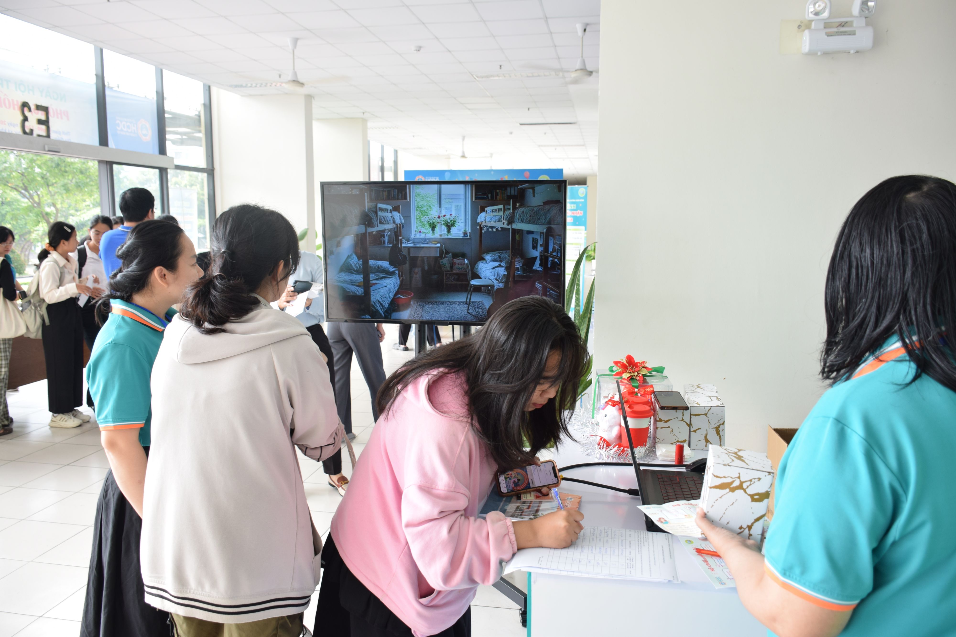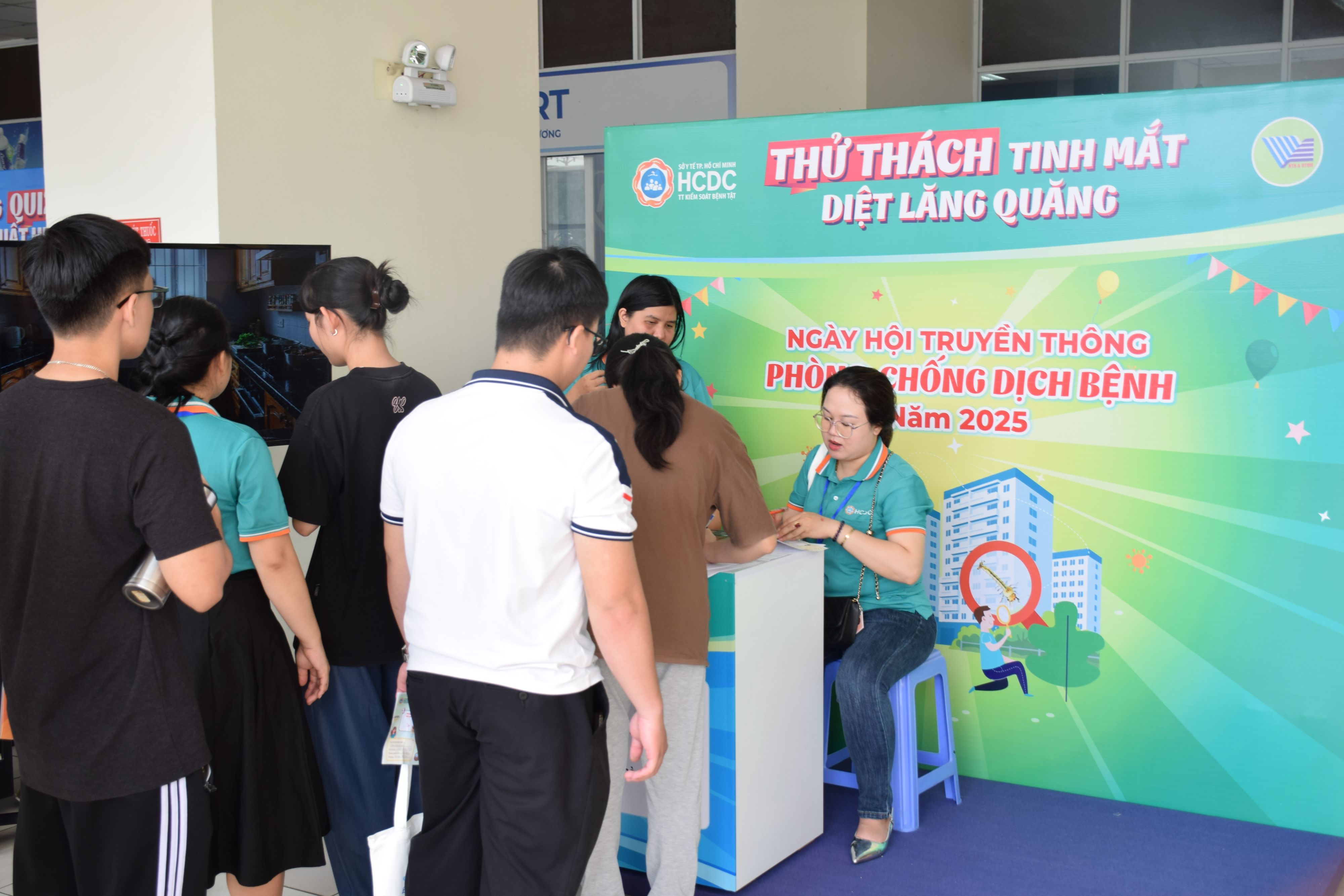 Bên ngoài hội trường, bốn gian hàng truyền thông tương tác được thiết kế sinh động đã thu hút đông đảo sinh viên tham gia, bao gồm các hoạt động Quiz kiến thức sốt xuất huyết 4.0, Check-in cộng đồng - Sống xanh Ký túc xá, thử thách “Tinh mắt diệt lăng quăng” và “Khoe phòng sạch - Đổi quà ngay”. Các hoạt động này được xây dựng theo hình thức trải nghiệm trực quan, giúp sinh viên tiếp cận kiến thức bằng cách thực hành ngay tại chỗ, từ việc nhận diện nguy cơ đọng nước, xử lý vật dụng có thể phát sinh lăng quăng đến lan tỏa thông điệp phòng, chống dịch bệnh trên mạng xã hội.