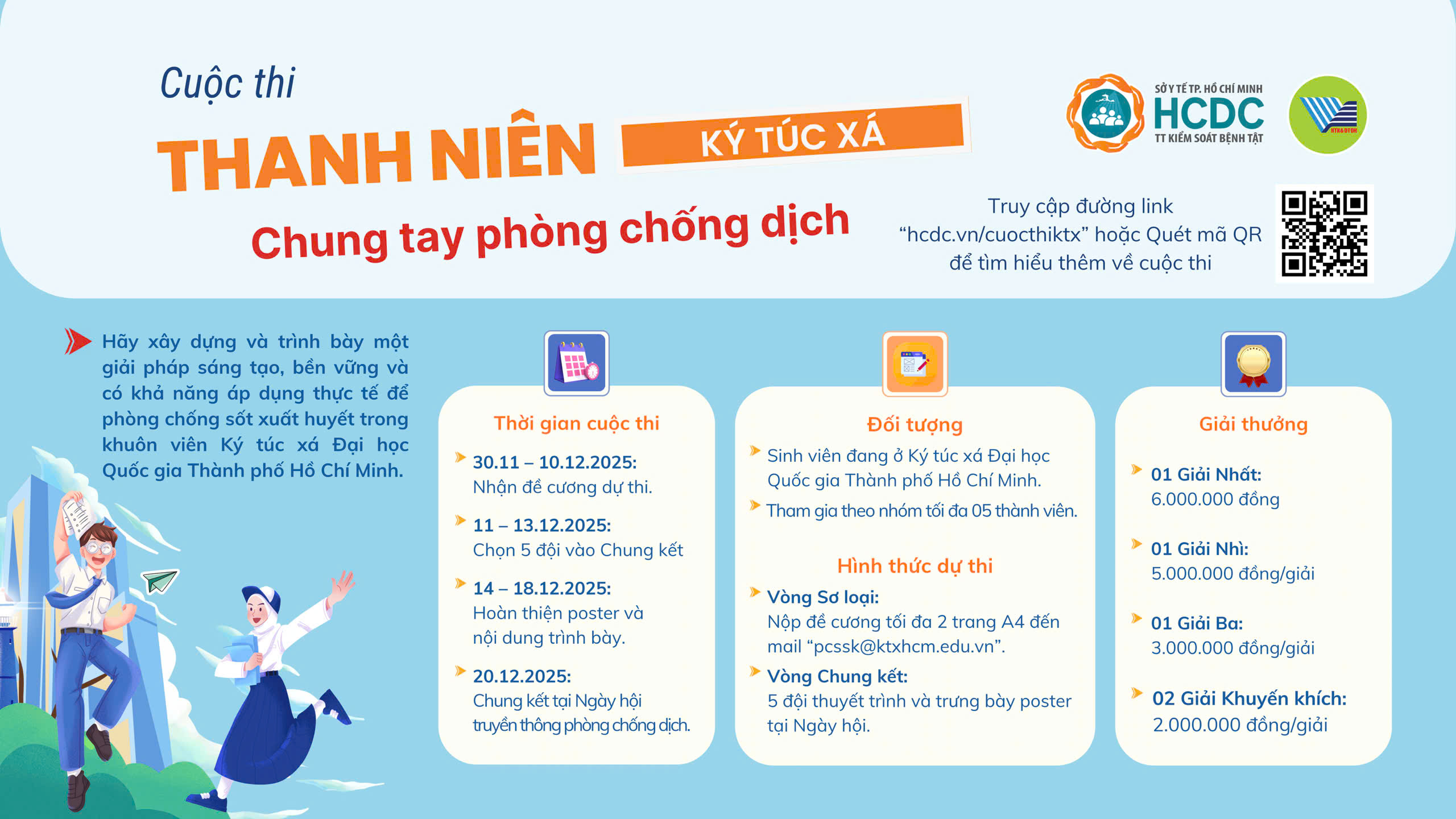 Những sinh viên hoàn toàn có khả năng tạo ra sự thay đổi tích cực và bền vững cho chính nơi mình sinh sống. Cuộc thi “Thanh niên Ký túc xá - Chung tay phòng chống dịch” do Trung tâm Kiểm soát bệnh tật Thành phố Hồ Chí Minh (HCDC) và Trung tâm Quản lý Ký túc xá và Khu đô thị Đại học Quốc gia Thành phố Hồ Chí Minh phối hợp tổ chức, nhằm tìm kiếm các giải pháp phòng, chống bệnh sốt xuất huyết có khả năng ứng dụng thực tế cao, góp phần kiến tạo môi trường ký túc xá xanh, sạch và an toàn.