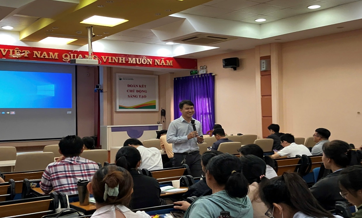 Ảnh: Ths. Bùi Hùng Mạnh chia sẻ kinh nghiệm cùng các nhân viên y tế tham dự buổi tập huấn