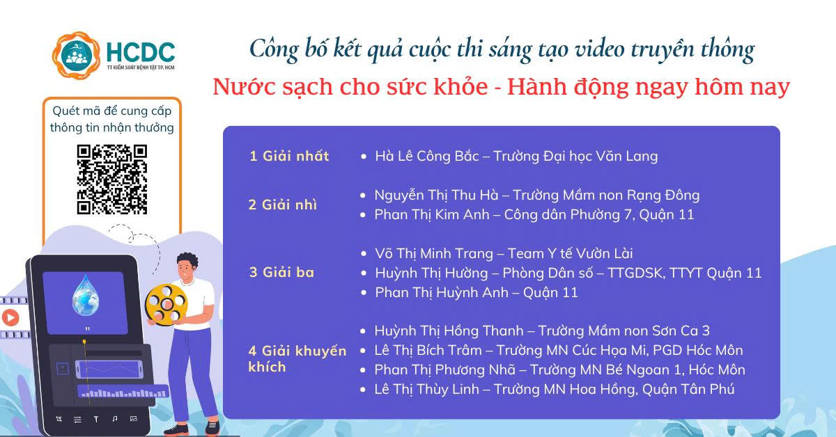 Trung tâm Kiểm soát bệnh tật Thành phố (HCDC) vô cùng phấn khởi khi nhận được nhiều tác phẩm ấn tượng, không chỉ thể hiện tài năng sáng tạo mà còn lan tỏa mạnh mẽ thông điệp ý nghĩa về tầm quan trọng của nước sạch đối với sức khỏe cộng đồng. Cuộc thi không chỉ là một sân chơi để các bạn thể hiện sự sáng tạo, mà còn là một diễn đàn tuyệt vời để mỗi cá nhân, mỗi tập thể cùng chia sẻ những góc nhìn độc đáo, kêu gọi ý thức giữ gìn nguồn nước, và đặc biệt là lan tỏa thông điệp về những hành động thiết thực.