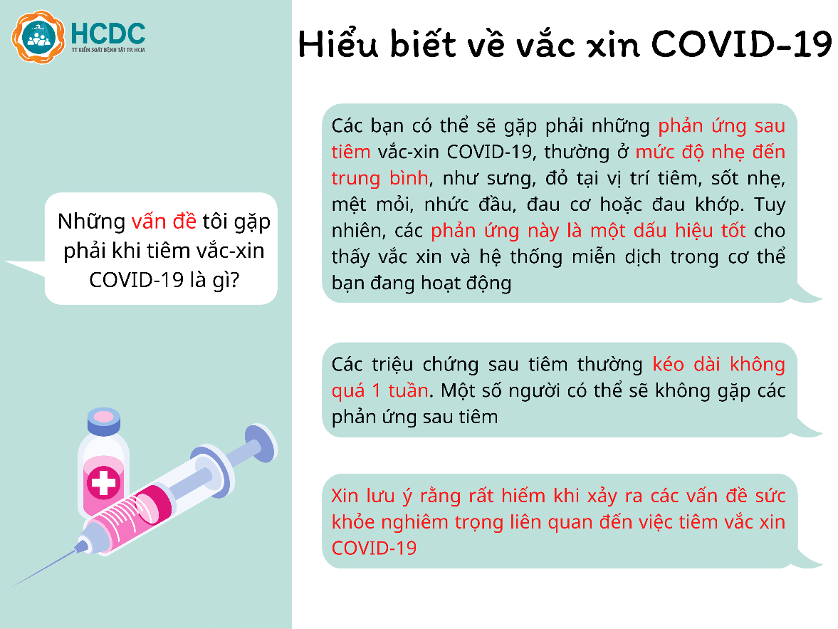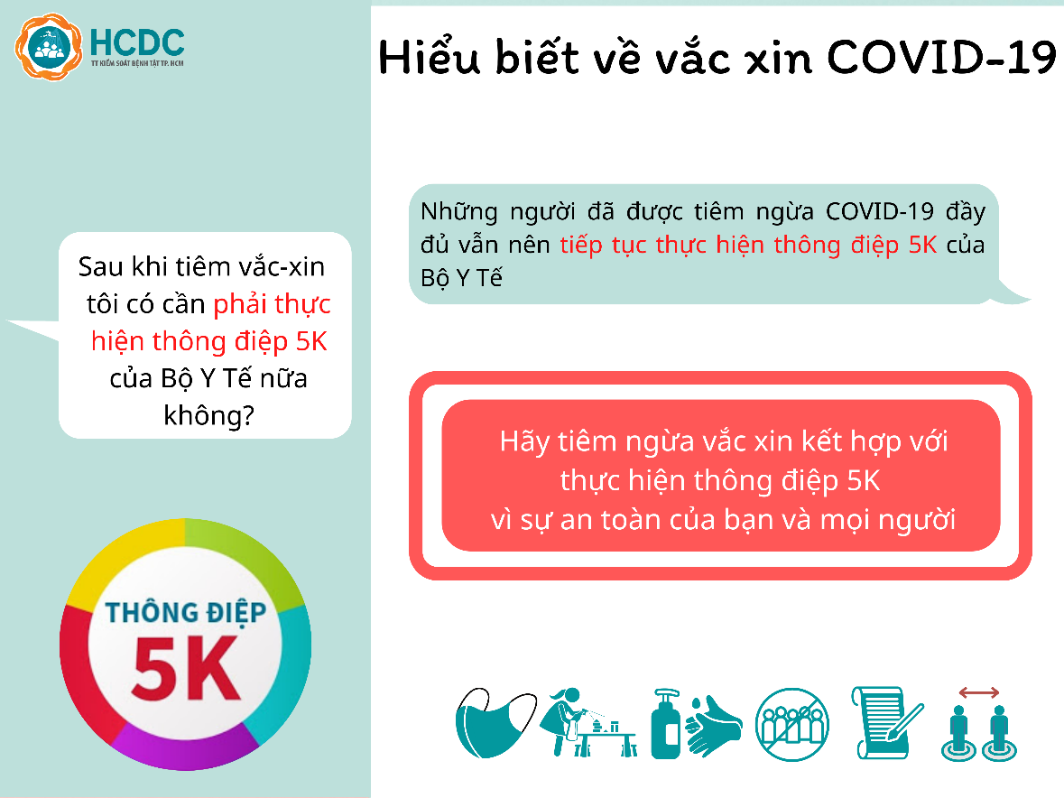 Đồng thời sau khi tiêm chủng vắc-xin, chúng ta vẫn phải tuân thủ thực hiện các biện pháp phòng chống dịch (thông điệp 5K) để đảm bảo an toàn cho mình, gia đình và cho cộng đồng trước đại dịch COVID-19.