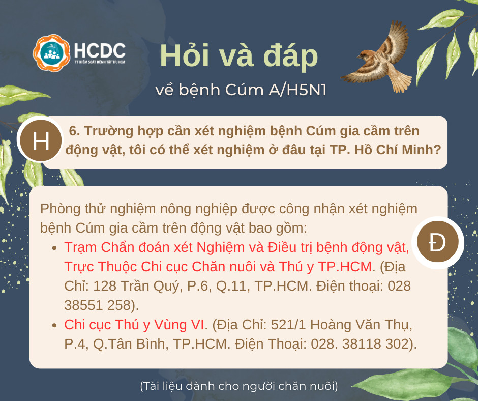 6. Trường hợp cần xét nghiệm bệnh cúm gia cầm trên động vật, tôi có thể xét nghiệm ở đâu tại TP. Hồ Chí Minh?