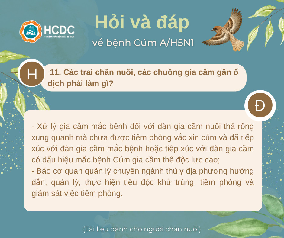 11. Các trại chăn nuôi, các chuồng gia cầm gần ổ dịch phải làm gì?