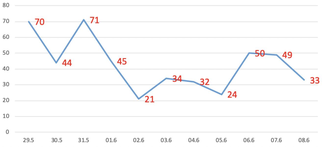 Tính từ ngày 31/05/2021 đến ngày 08/06/2021, đã có 507 trường hợp (+) được nhập viện điều trị tại các bệnh viện được phân công chuyên tiếp nhận điều trị các trường hợp COVID-19 (+) trên địa bàn thành phố, trong số đó có 18 bệnh nhân nặng cần hồi sức tích cực chiếm tỷ lệ khoản 3,5%, 1 trường hợp COVID-19 (+) tử vong do bệnh diễn tiến nặng có bệnh lý nền là suy thận mạn, 1 trường hợp nghi mắc COVID-19 tử vong do bệnh diễn tiến nhanh, có bệnh lý nền là tiểu đường, cao huyết áp.