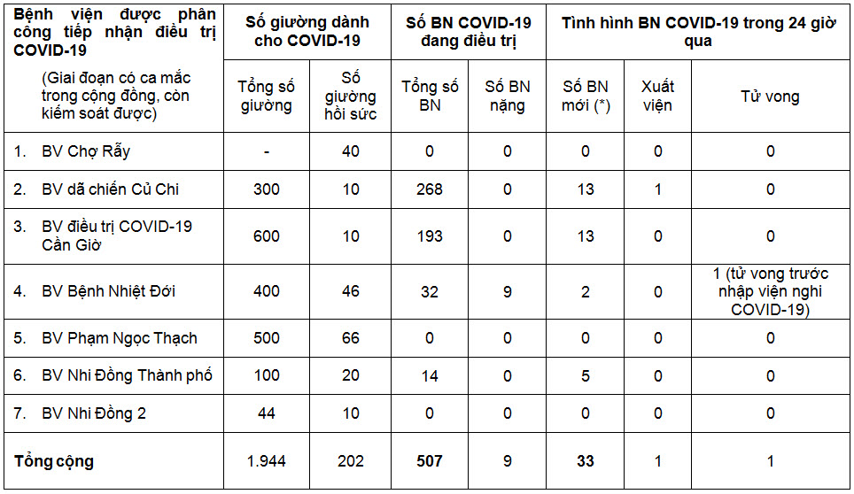 - BV Dã chiến Củ Chi tiếp nhận người bệnh (+) từ các Khu cách ly: Quận Phú Nhuận (03), Quận Tân Phú (01), Đại học Huflit (02), Quận 8 (01), Quận Bình Tân (01), Thành phố Thủ Đức (01), Khu C (01) và BV Triều An (01), BV Quận Tân Phú (02)