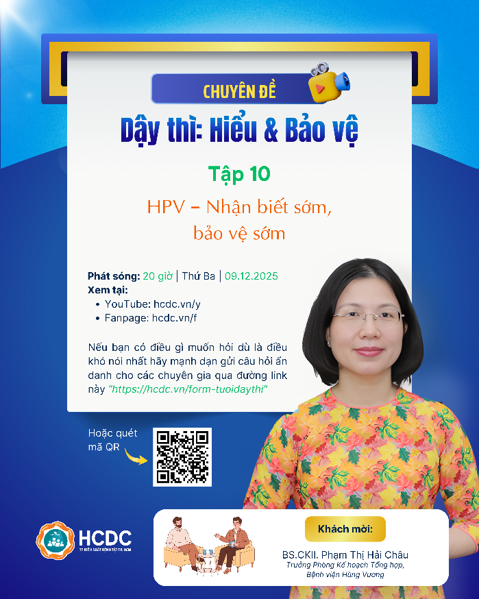 Tập 10 sẽ được phát sóng lúc 20 giờ Thứ Ba, ngày 09.12.2025. Nếu bạn chưa từng tìm hiểu về vi rút HPV, hãy dành thời gian theo dõi. Nếu bạn muốn giúp bạn bè hiểu đúng hơn, hãy chia sẻ. Và nếu có những điều khó nói nhưng cần được giải đáp, bạn có thể gửi câu hỏi ẩn danh đến chuyên gia qua đường dẫn https://hcdc.vn/form-tuoidaythi
