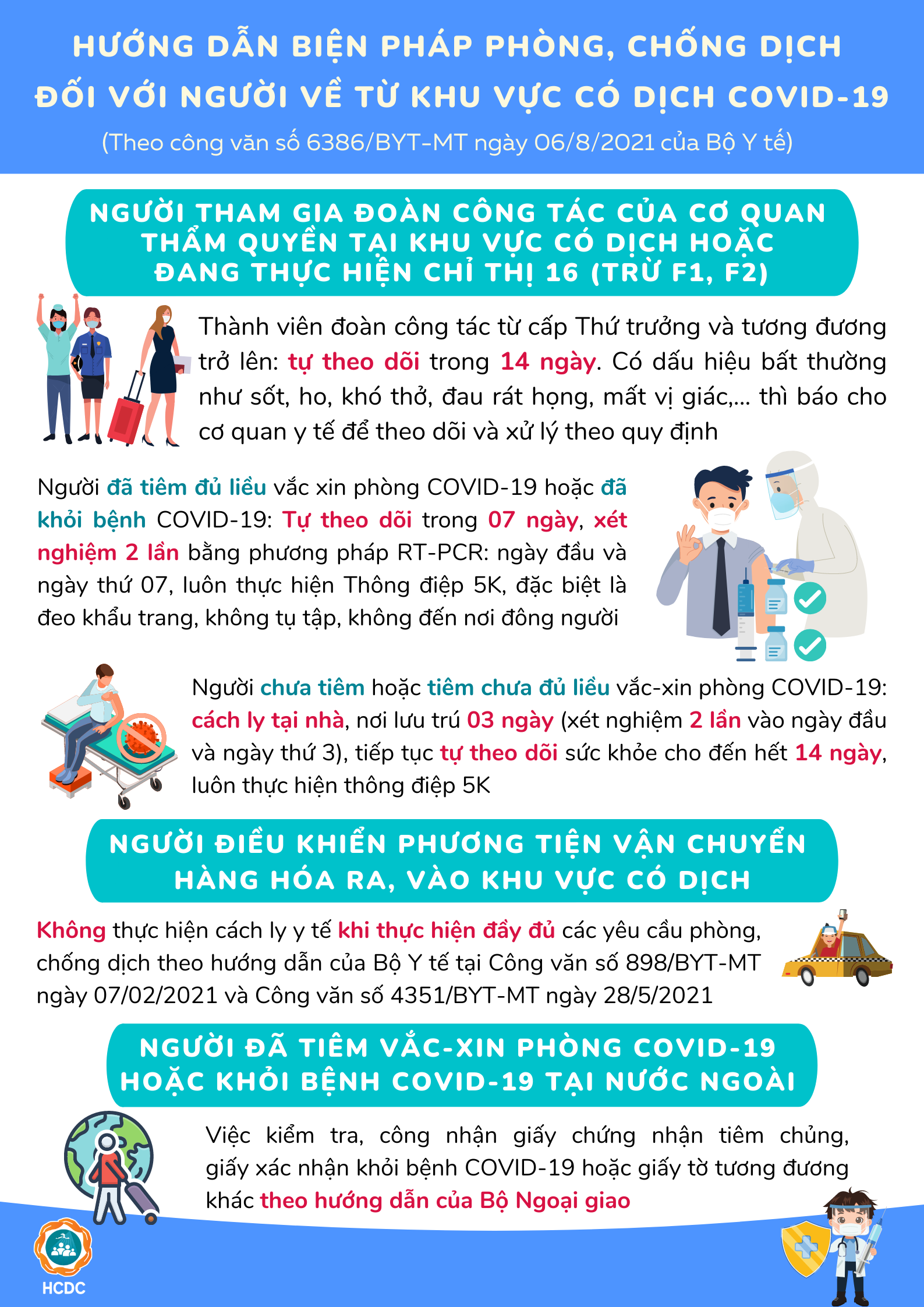 Hiện nay, tình hình dịch COVID-19 đang diễn biến phức tạp tại nhiều địa phương; thực hiện Công điện số 1063/CĐ-TTg ngày 31/7/2021 của Thủ tướng Chính phủ về phòng, chống dịch COVID-19 và để kịp thời kiểm soát tình hình dịch bệnh, Bộ Y tế đã ban hành văn bản hướng dẫn biện pháp phòng, chống dịch đối với người về từ khu vực có dịch COVID-19.