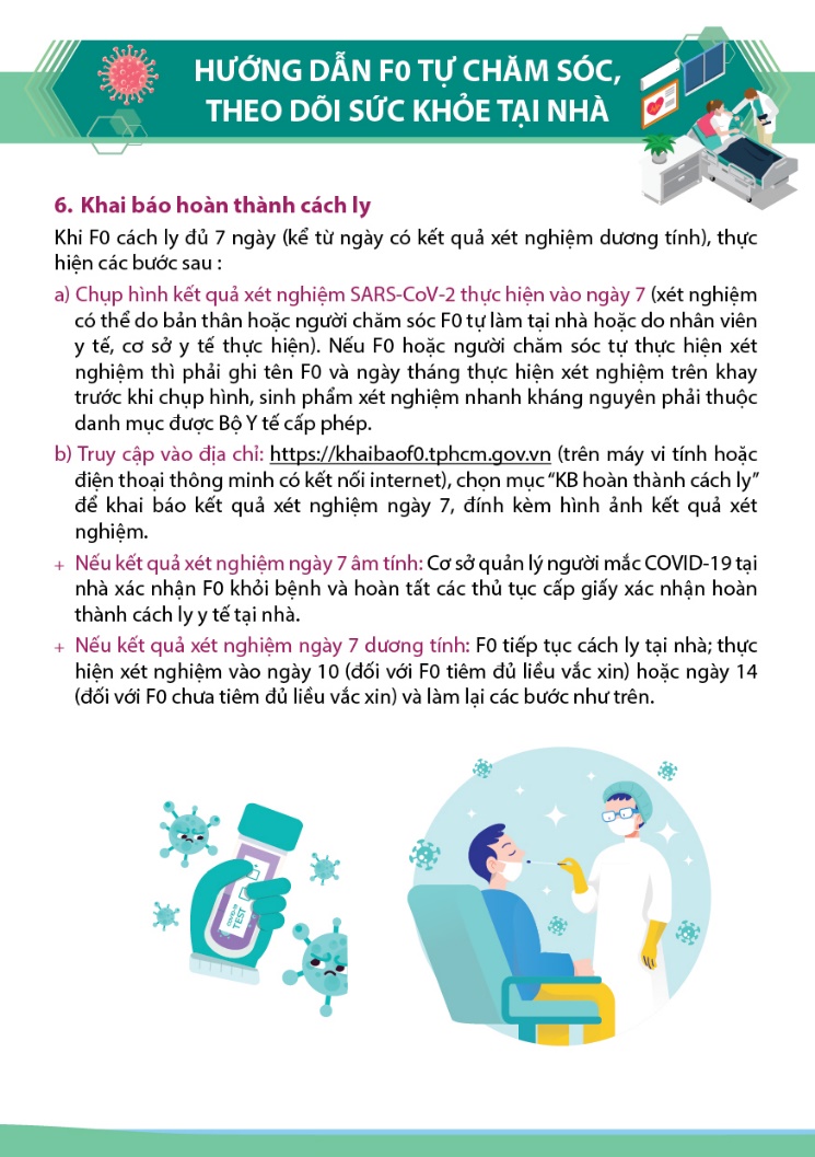 Sau khi khai báo với Trạm y tế nơi cách ly và được đánh giá đủ điều kiện cách ly tại nhà, F0 cần tuân thủ hướng dẫn điều kiện cách ly tại nhà và tự chăm sóc, theo dõi sức khỏe hàng ngày.